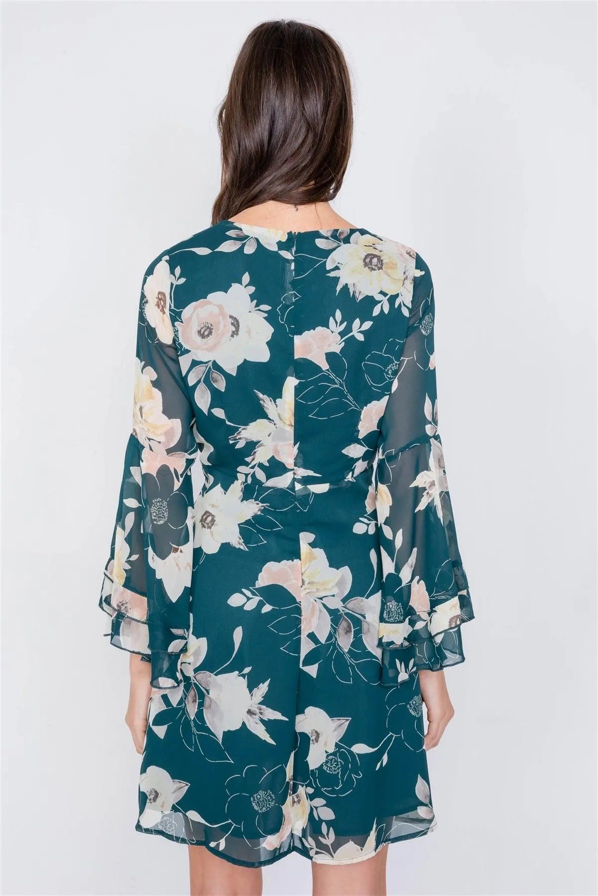 Green Floral Print Bell Sleeve Fit & Flare Mini Dress /2-1-3