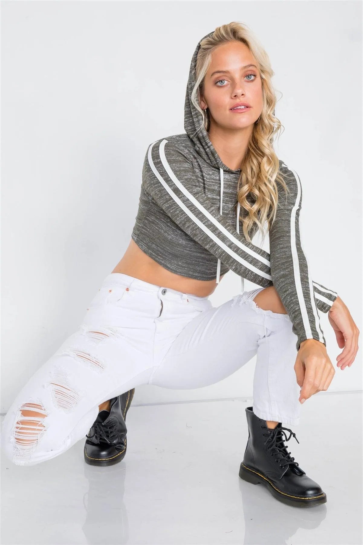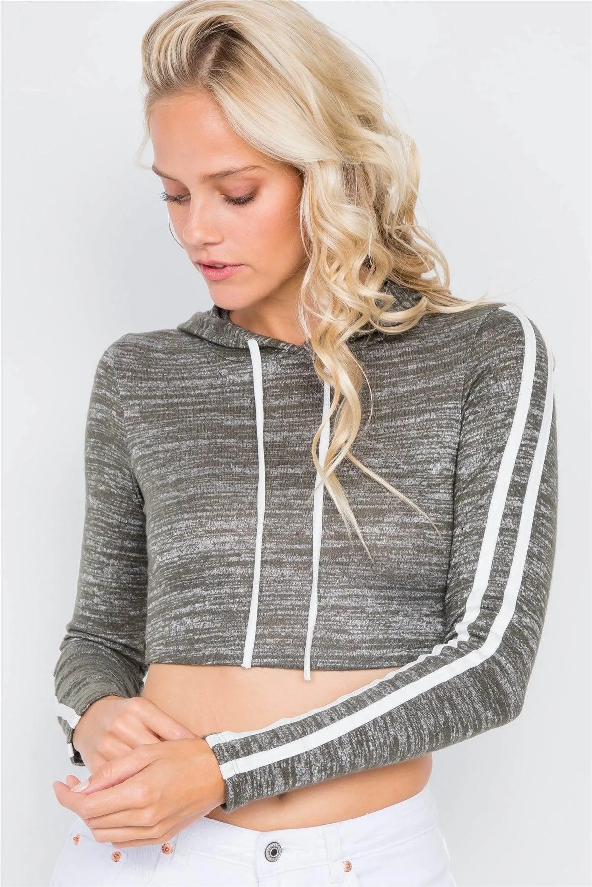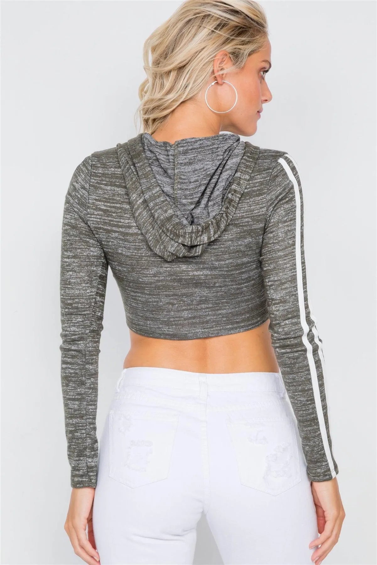 Top: crop jacket, white trim, heathered design, draw string hoodie, jersey material, unlined, very stretchy. Model is 5'8 and wearing a Small ( Bust: 32B", Waist: 25", Hips: 35.5")Item Measurements: Length: 14", Bust: 30", Sleeves: 24"True to size