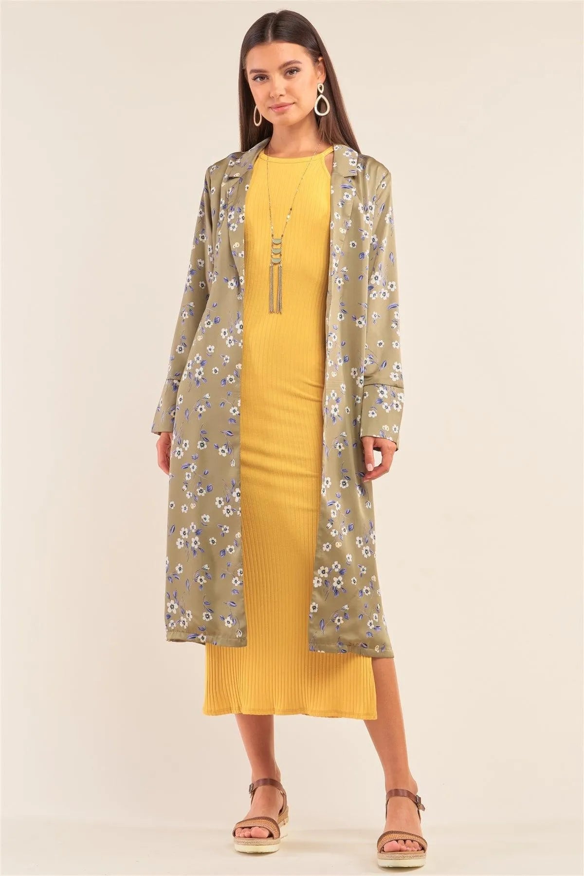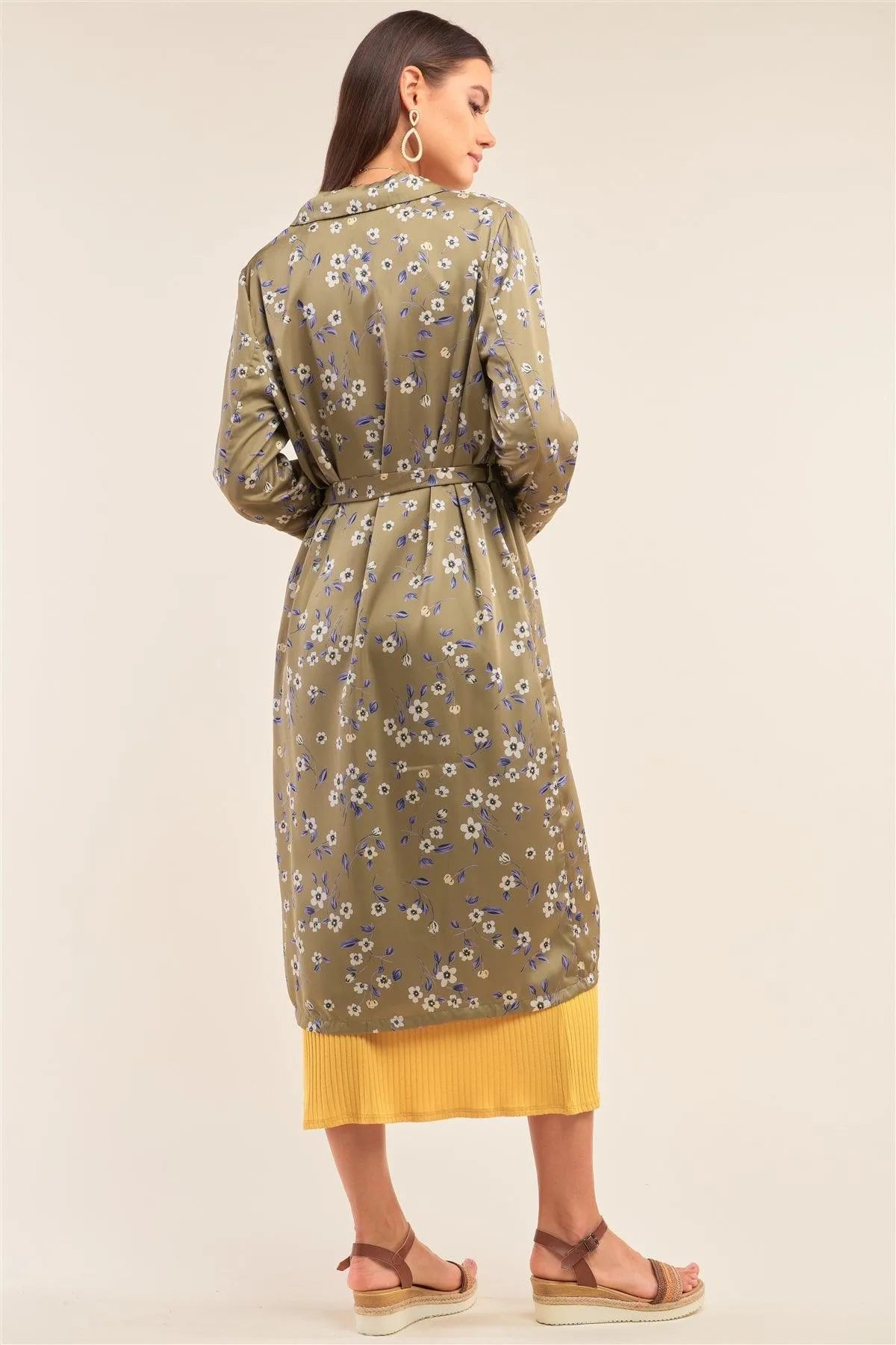 Green Multi Floral Satin Open Front Self Tie Duster Coat /2-2-2