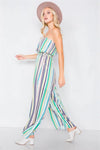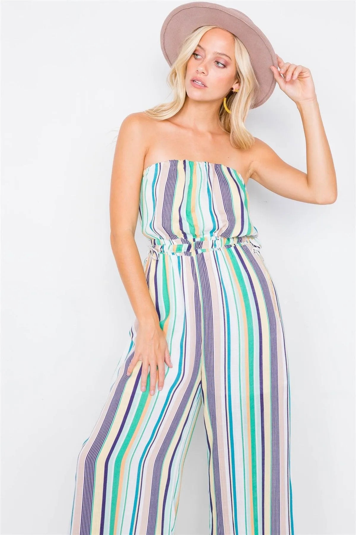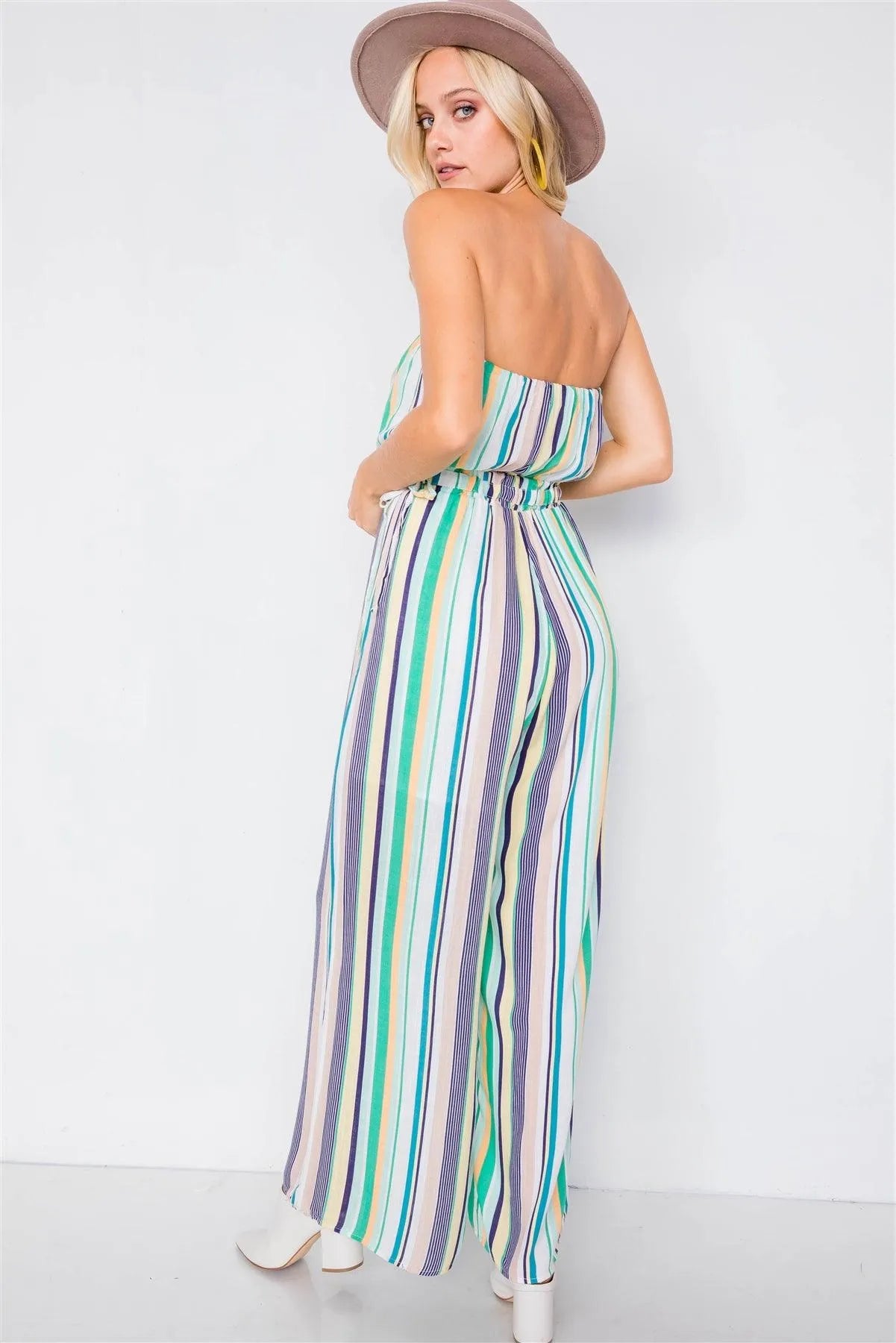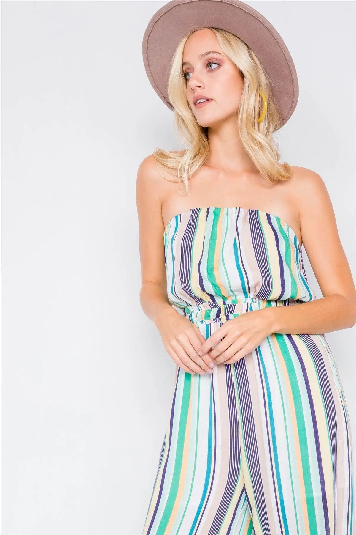 Green Multi Stripe Strapless Lightweight Wide Leg Jumpsuit /4-2-1