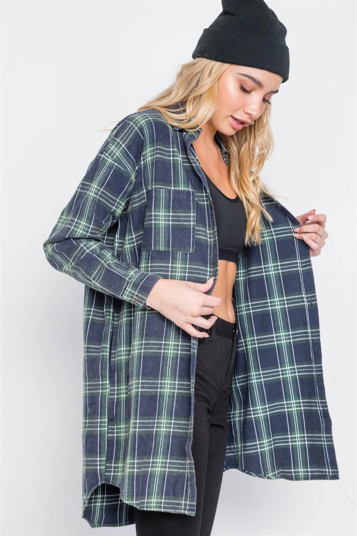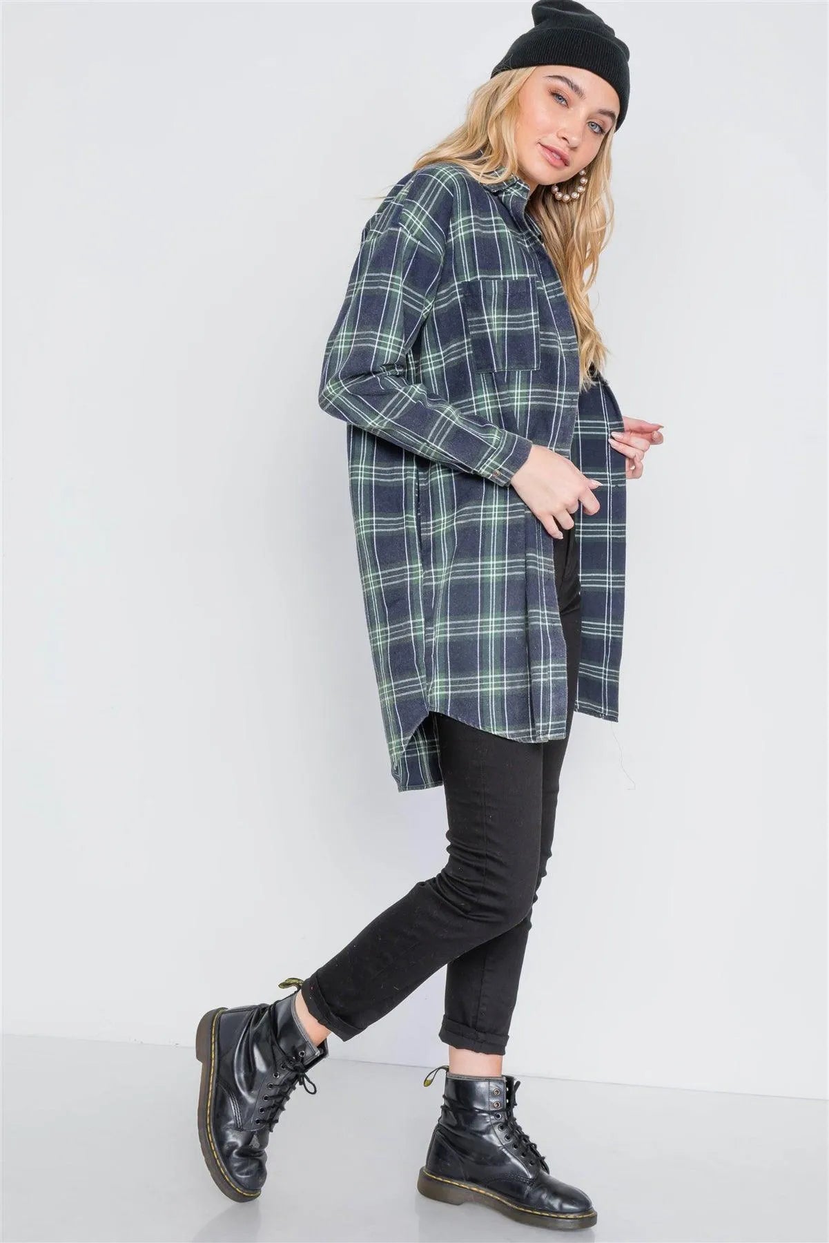 Green Plaid Button Down Long Sleeve Shirt Dress /1-3-2-1-1