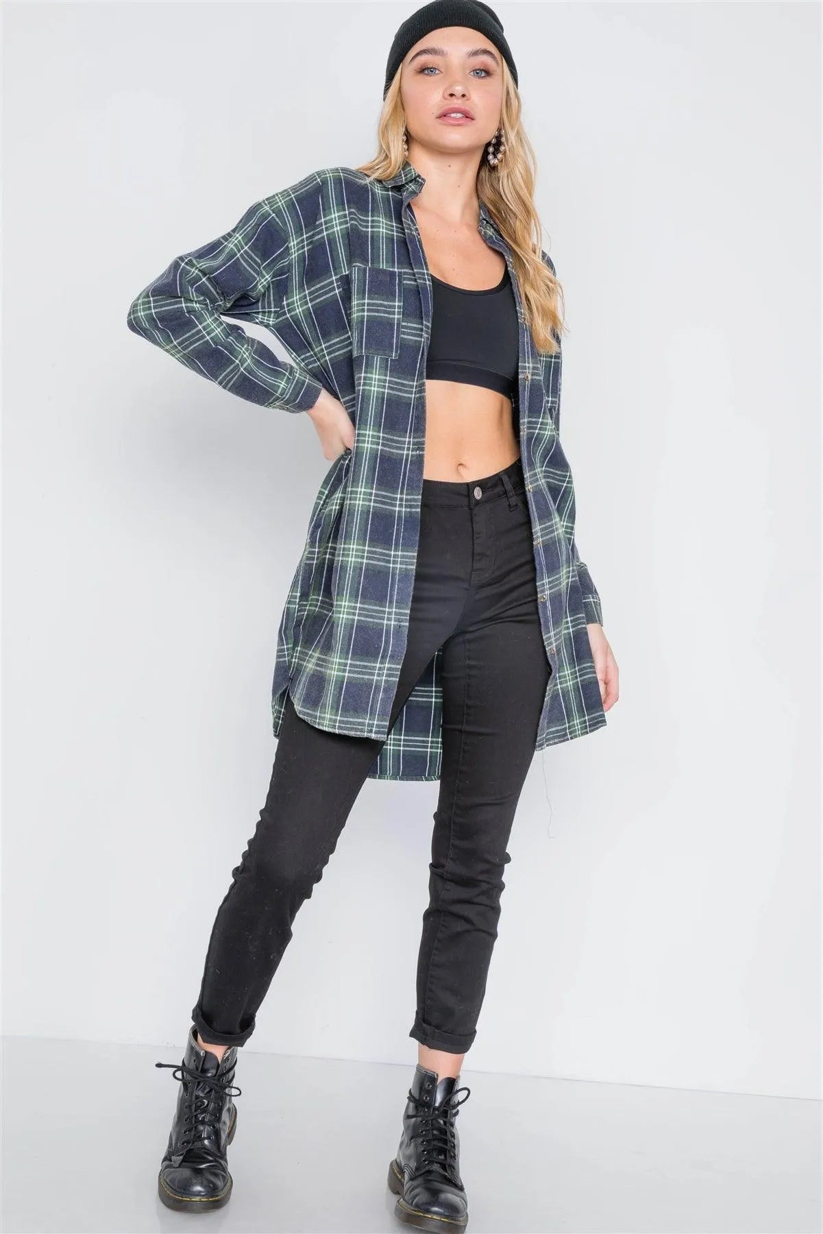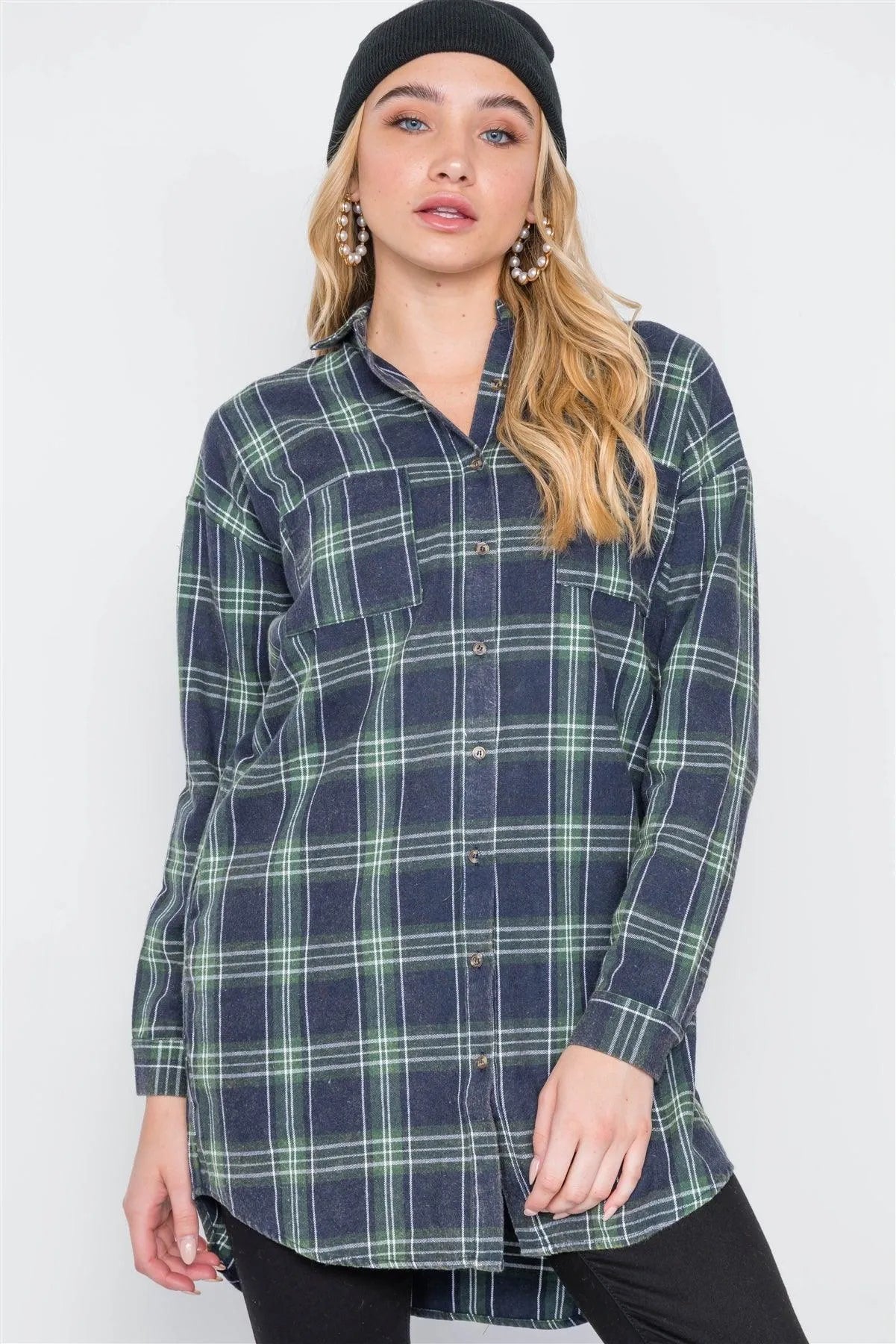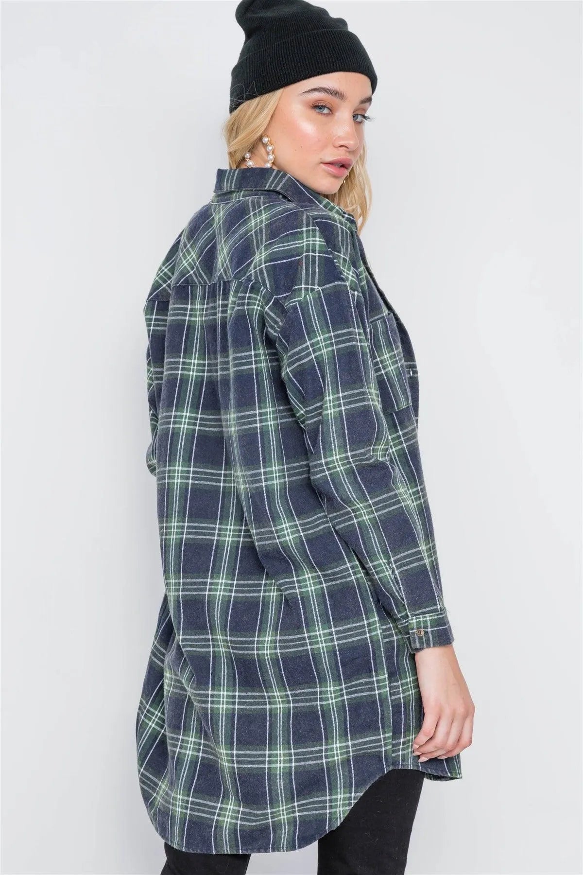 Green Plaid Button Down Long Sleeve Shirt Dress /2-3-2-1