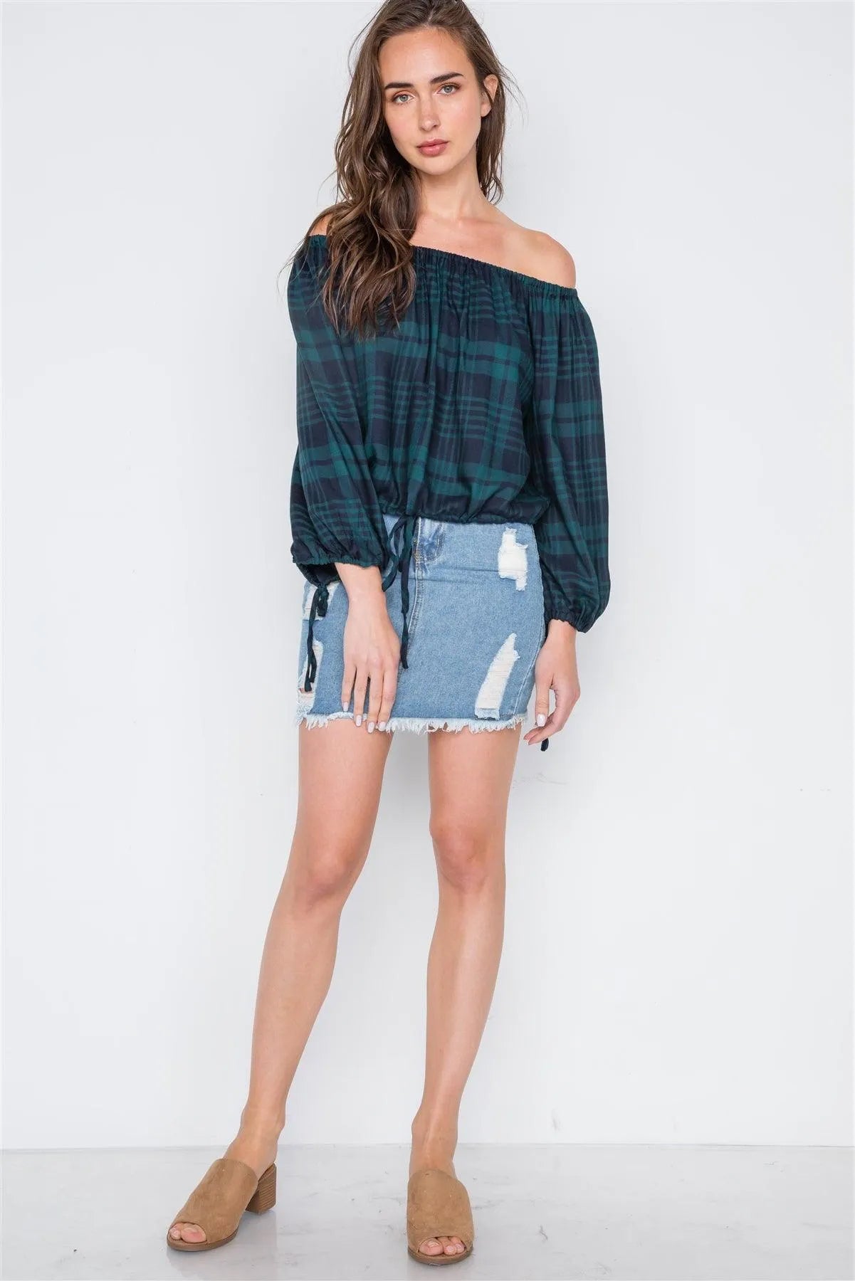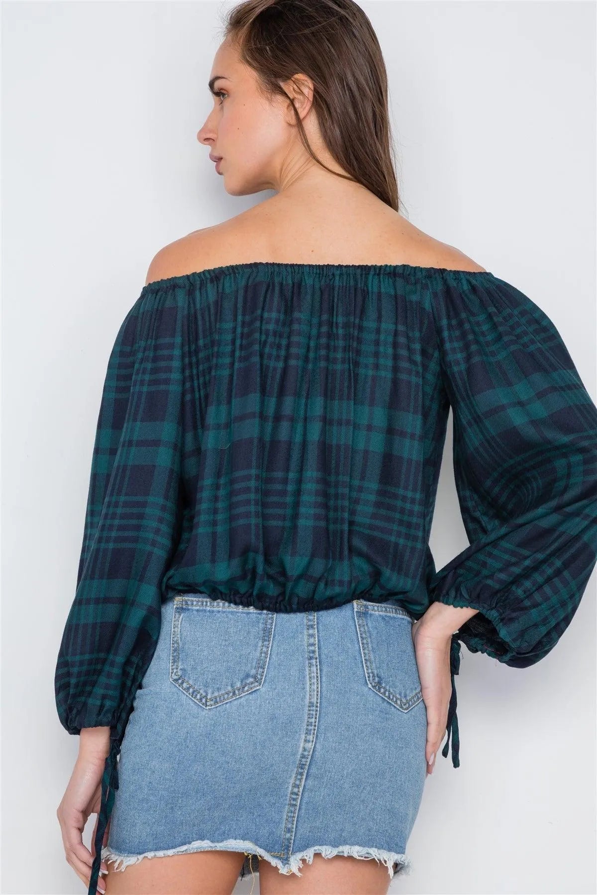 Green Plaid Off-The-Shoulder Top /2-3-3