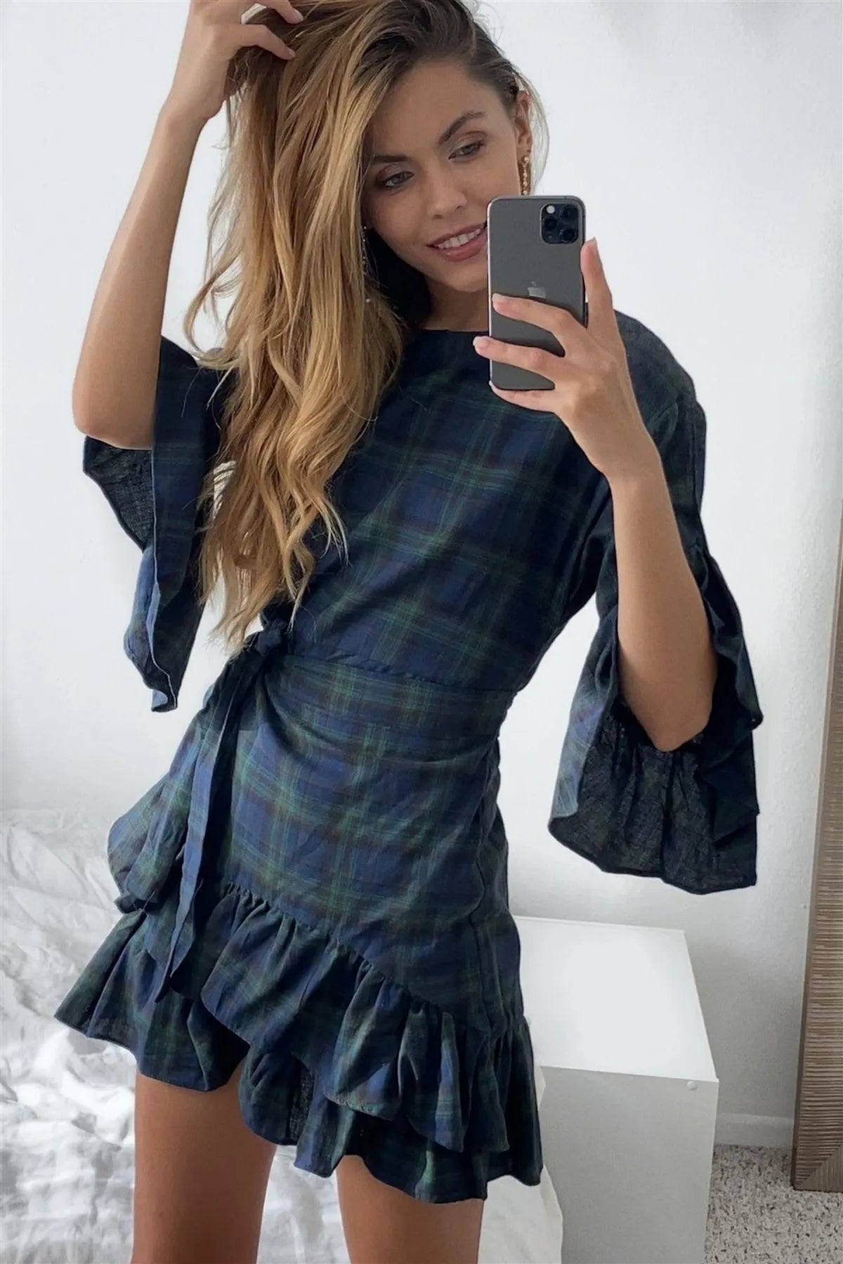 🖤 Item features: green, blue, short shirred sleeve, front layer that ties on the side, shirred hem, plaid print allover, unlined, trendy, mini length, tight fitting, casual.
