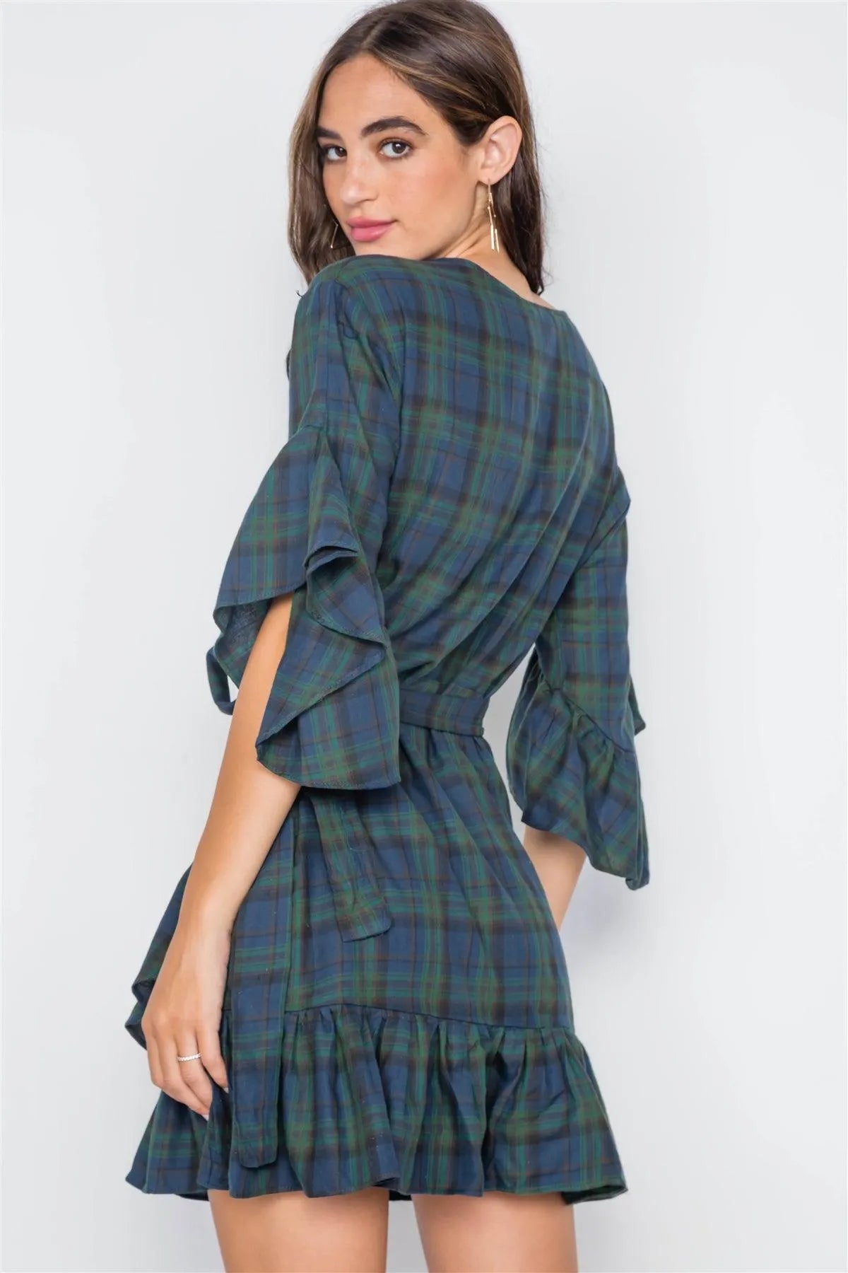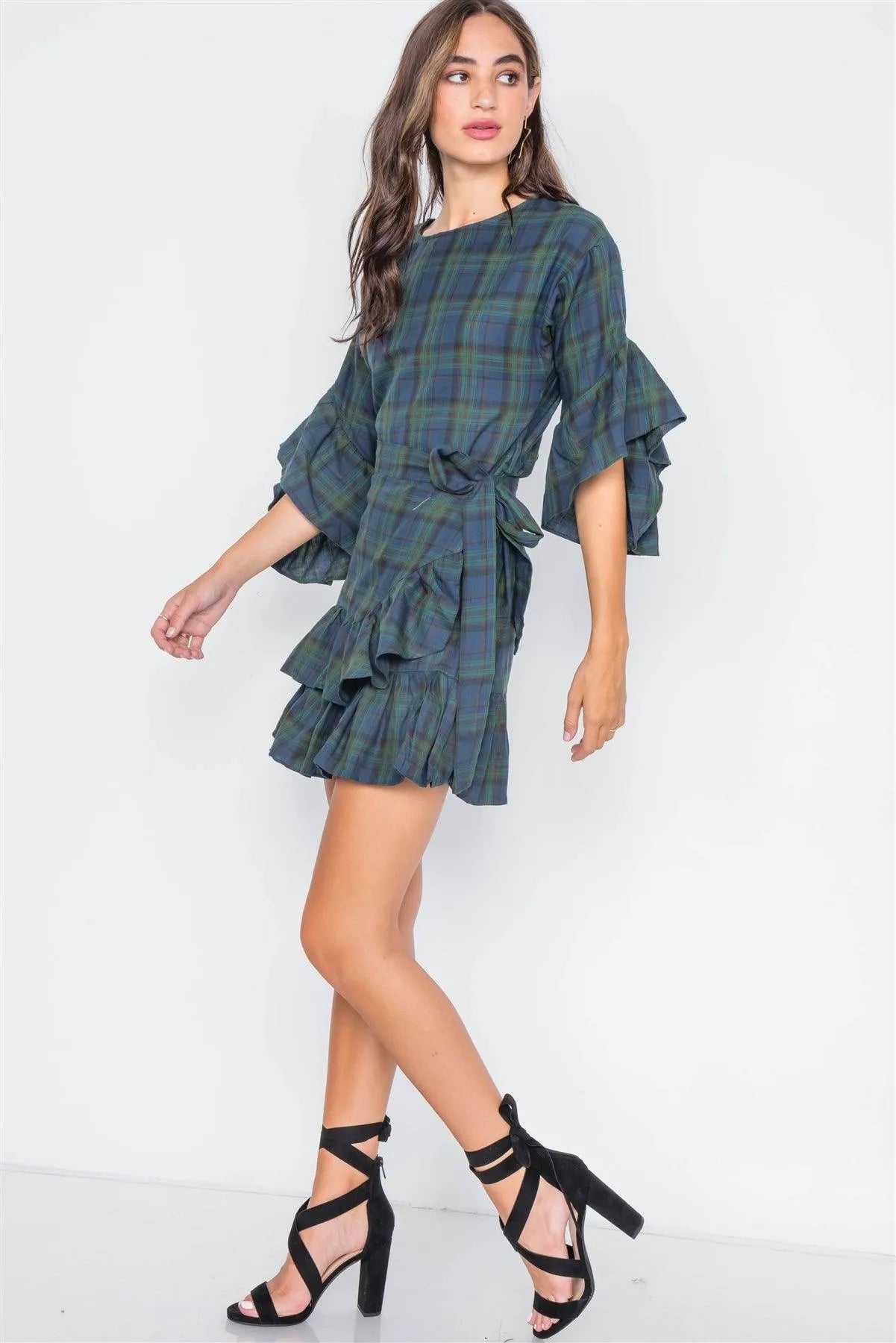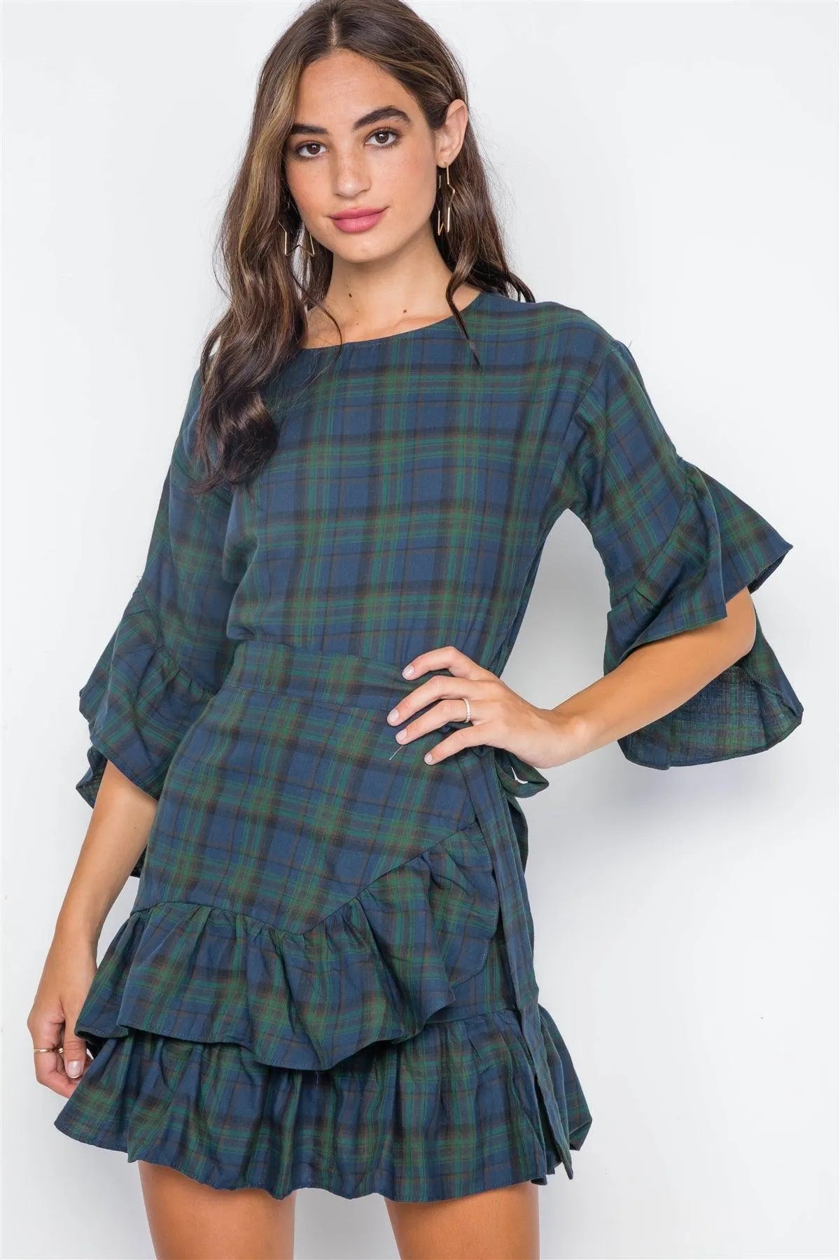 Green Plaid Shirred Hem Front-Tie Mini Dress /2-2-2