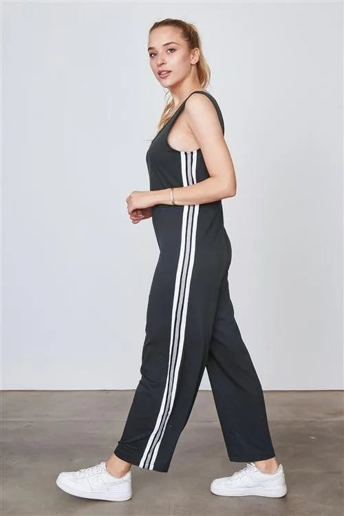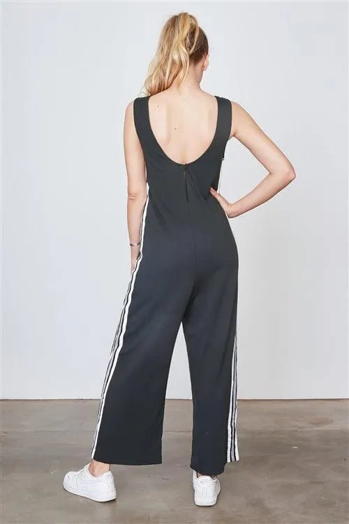 Jumpsuit features: sleeveless, back button closure, back keyhole, ankle length, wide leg, unlined, soft fabric, contrast side stripe detail, relaxed fit.Model is 5'9" and wearing small (Waist: 28", Bust: 34C", Hips: 36" )Small Size Item Measurements: Length: ankle length, Bust: 36"