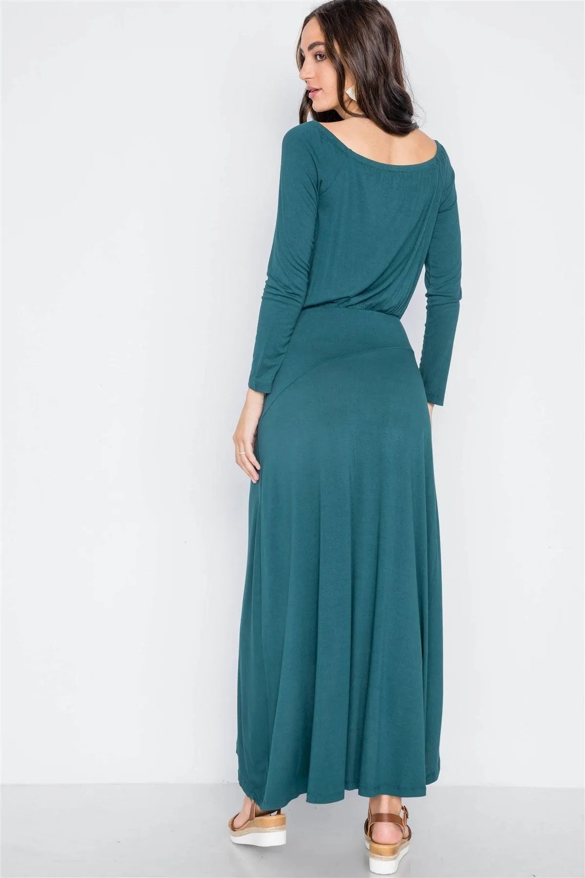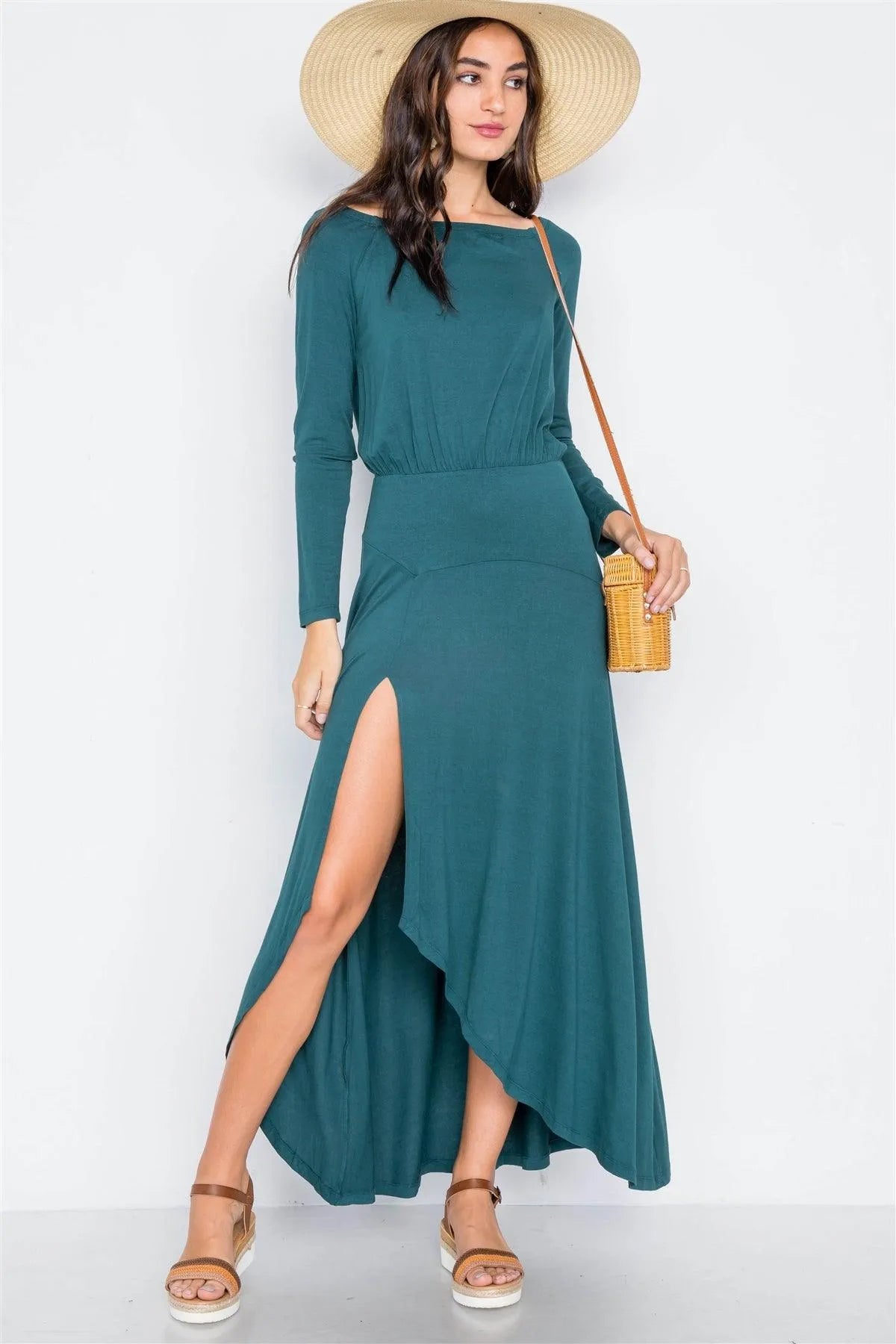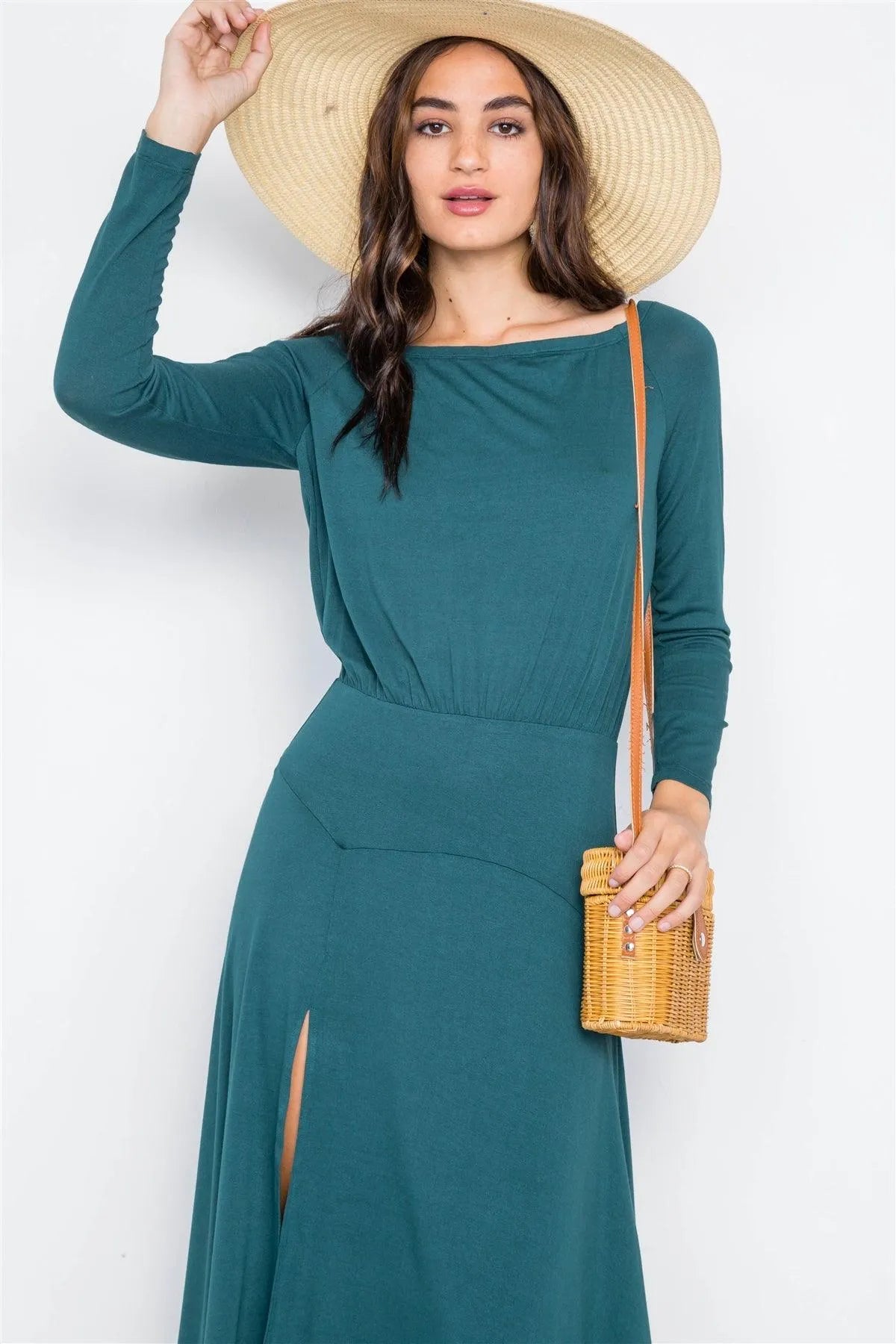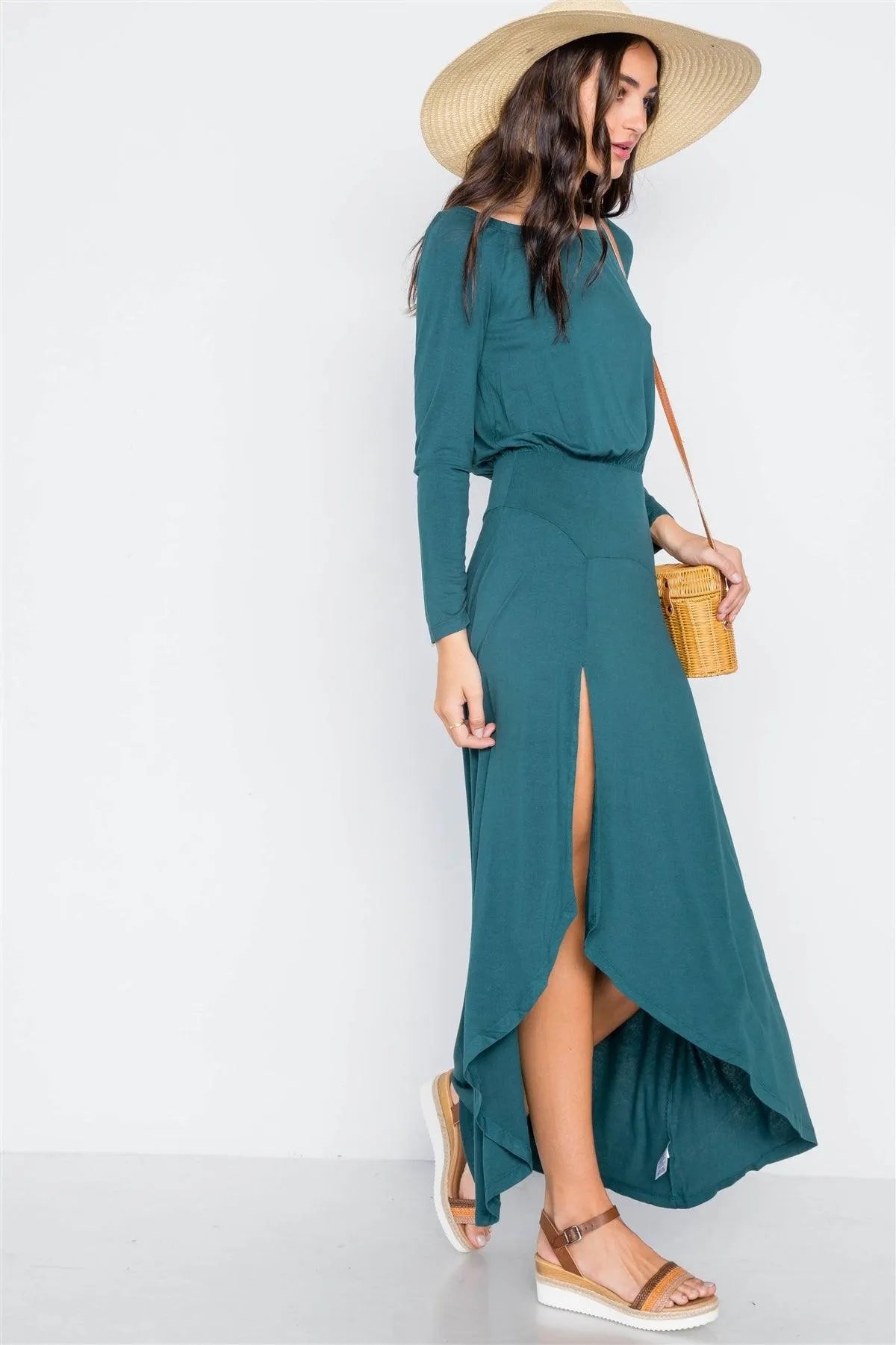Green Solid Long Sleeve Side Slit Maxi Dress /2-2-2