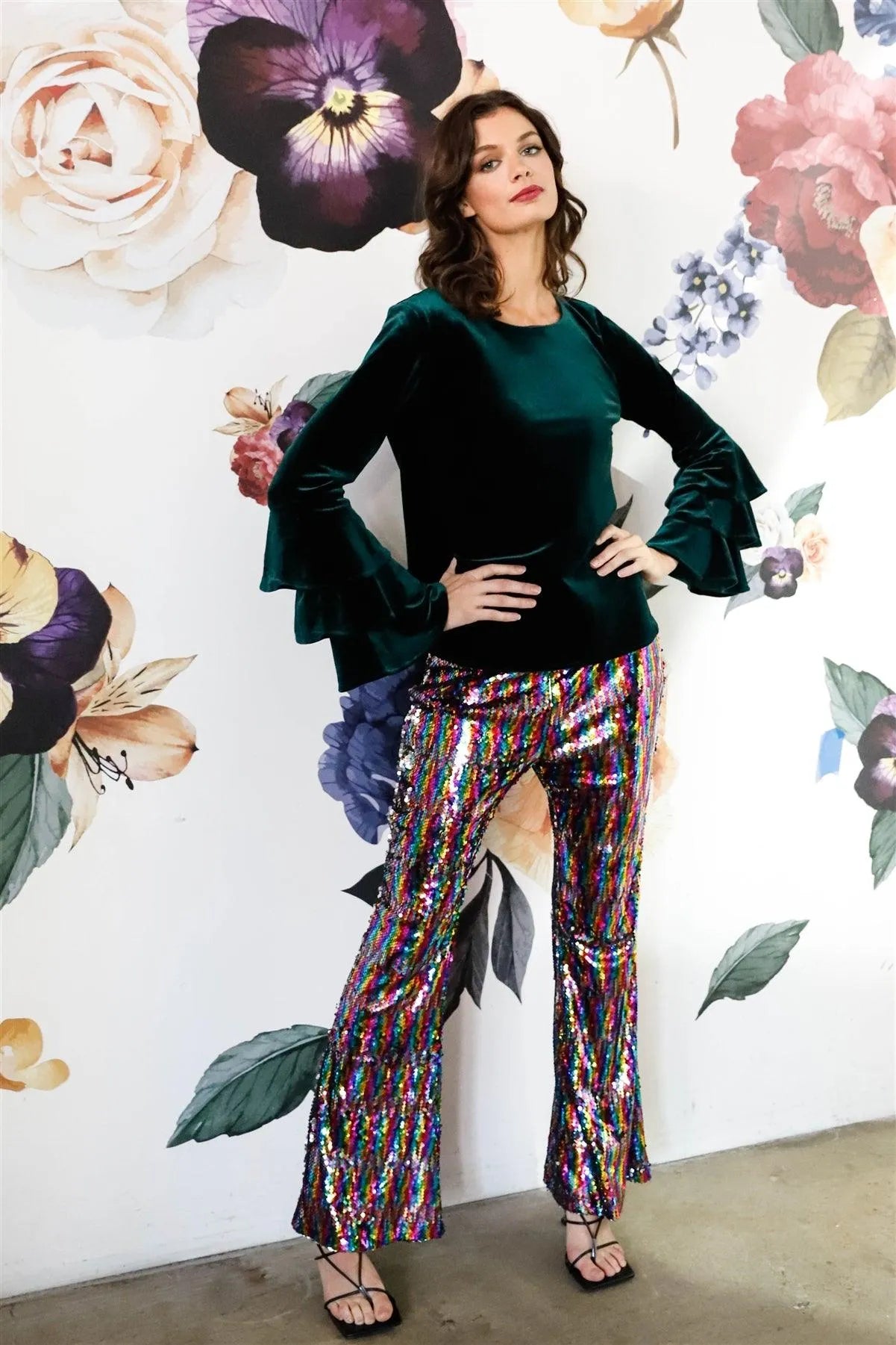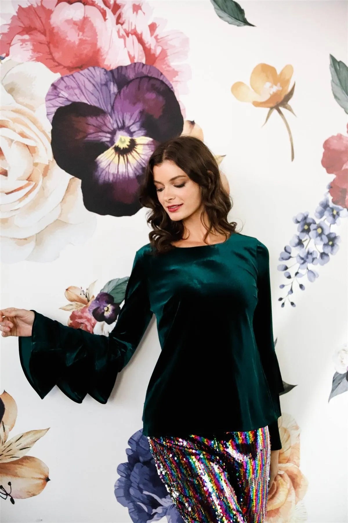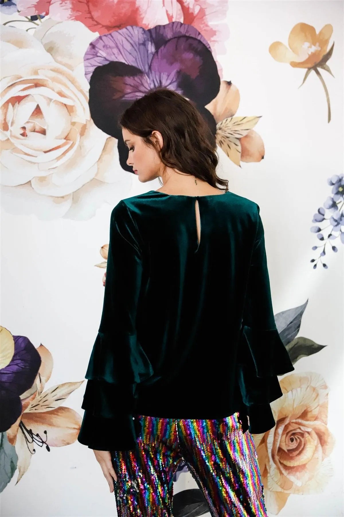 Green Velvet Ruffled Long Sleeve Relaxed Top /1-1-2-2