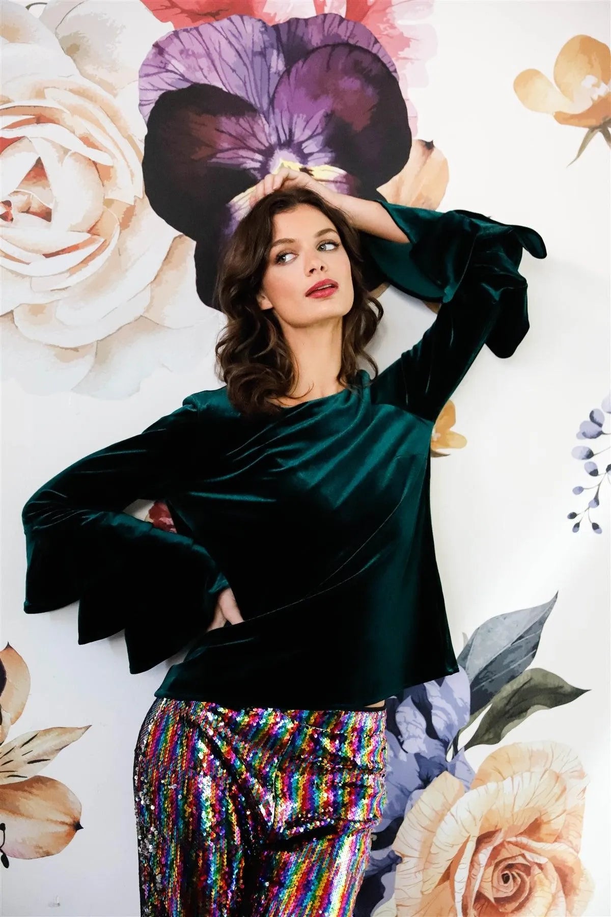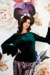 Green Velvet Ruffled Long Sleeve Relaxed Top /1-2-2-1
