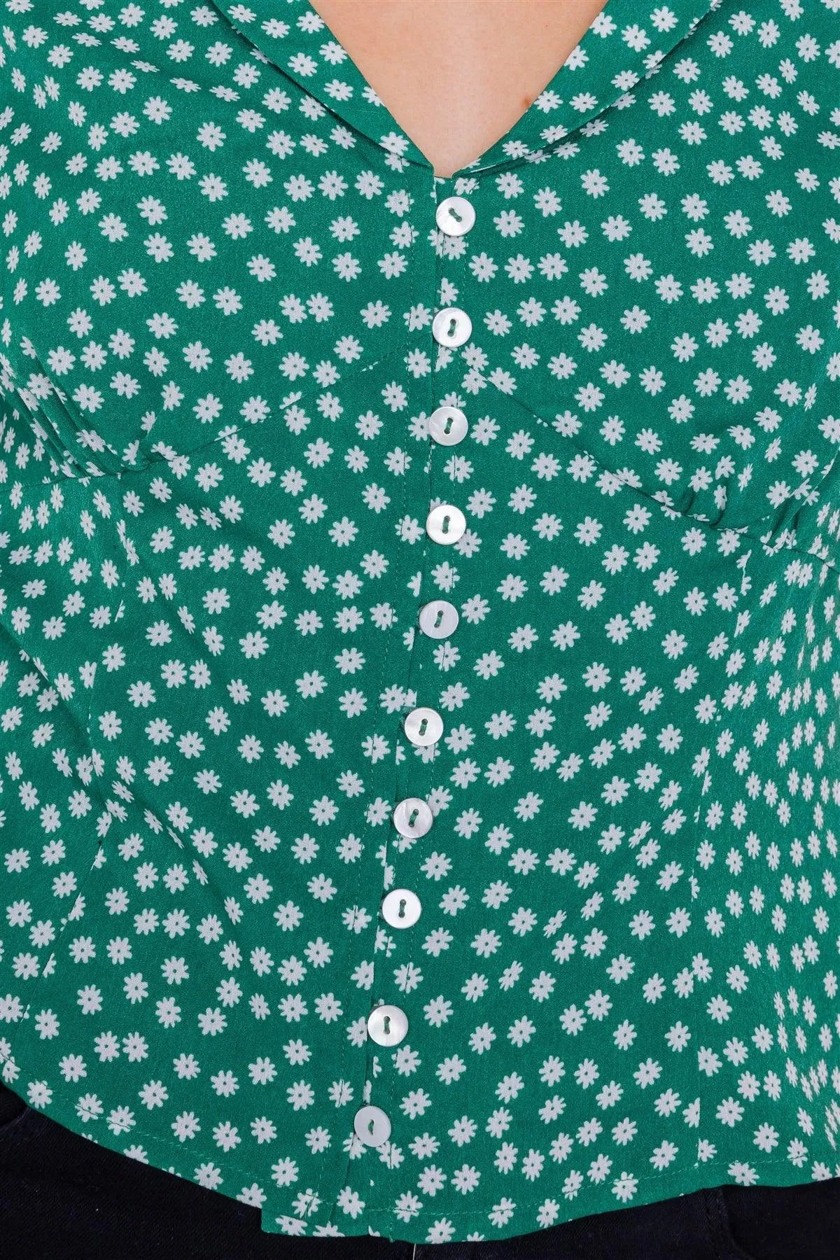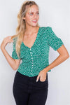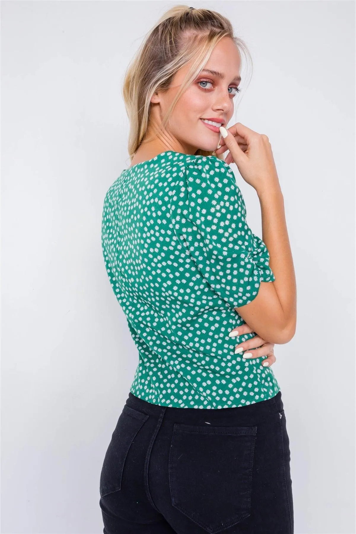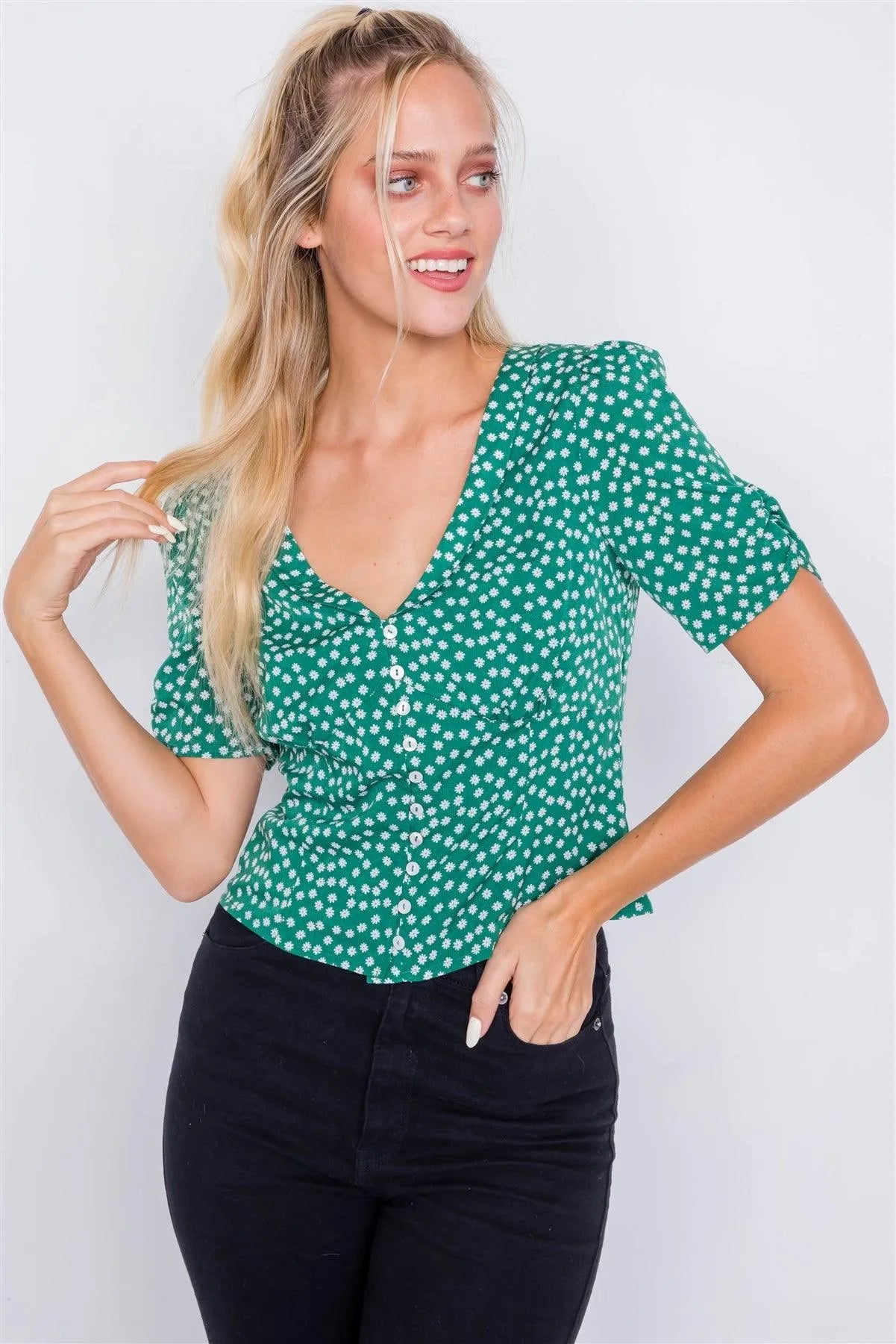 Green White Floral Chic Short Cinched Sleeve V-Neck Top /3-2-1