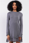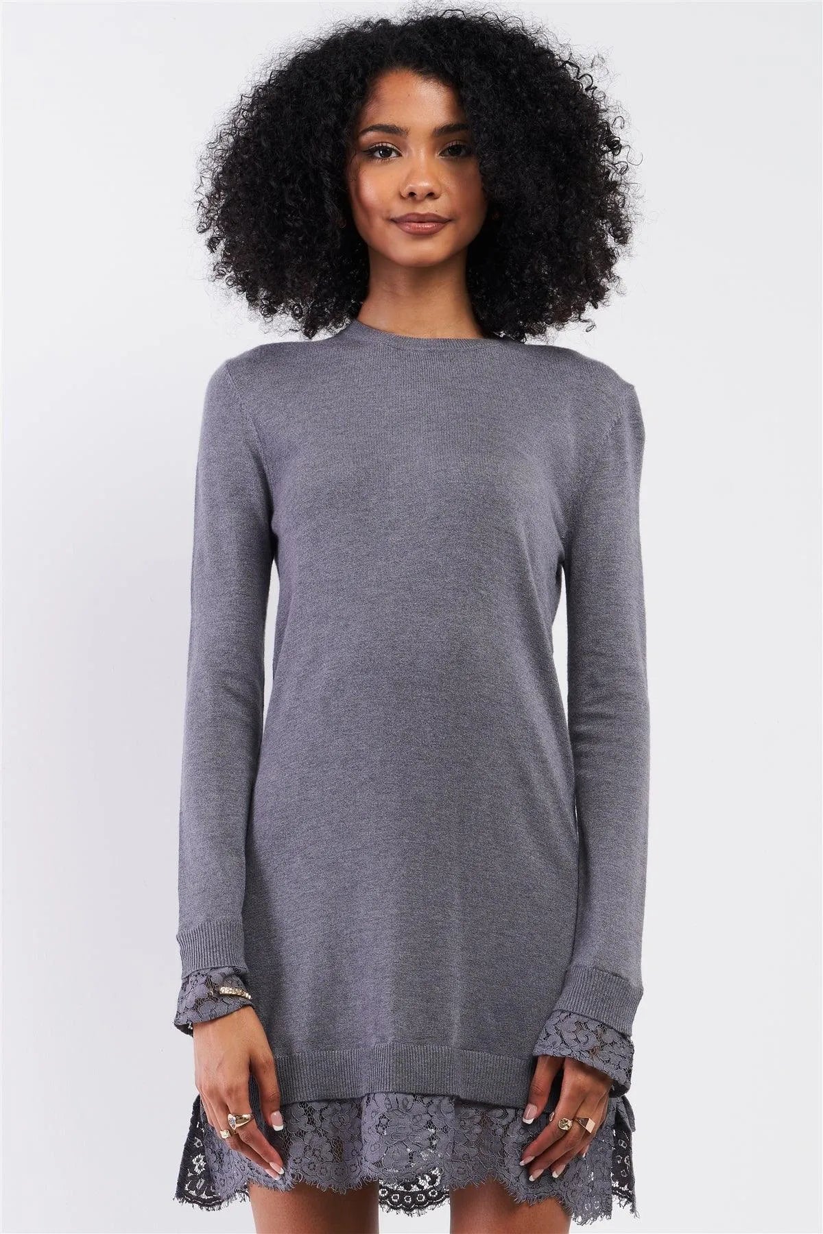 🖤 Item Features: Solid, grey, long sleeve, crochet lace hem insert detail, contrast lace cuffs, round ribbed neckline, relaxed fit, unlined, mini length, comfy, stretchy, causal, cozy, soft, warm, fall/winter collection