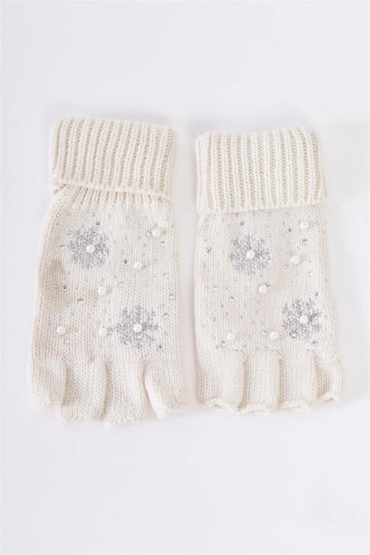 Ivory Fingerless Snowflakes Pearl Rhinestone Winter Gloves /2 PiecesVendor:Fame