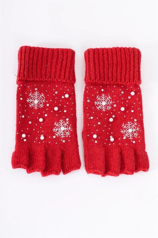Red Fingerless Snowflakes Pearl Rhinestone Winter Gloves /3 PiecesVendor:Fame