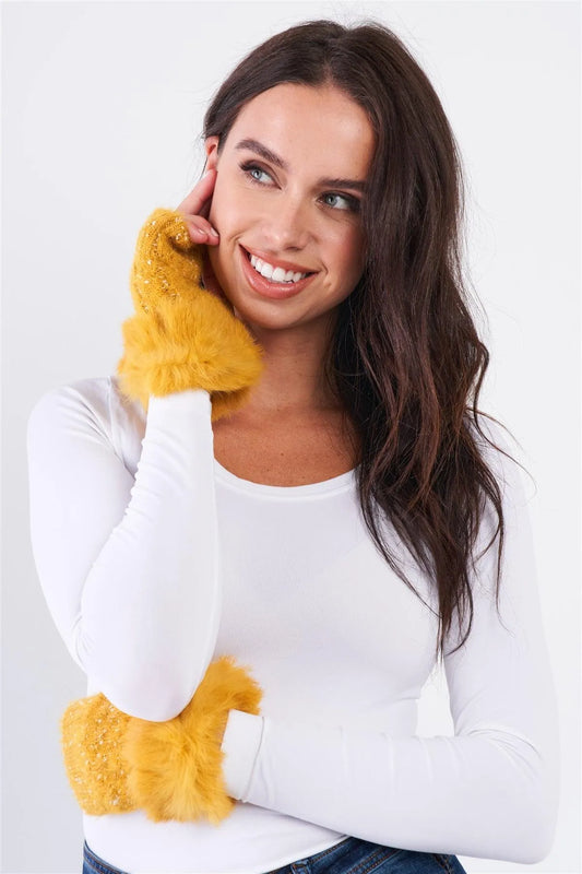 Mustard Woven Furry Fingerless Two-Way Winter Gloves /3 PiecesVendor:Fame