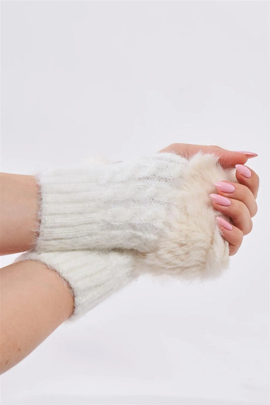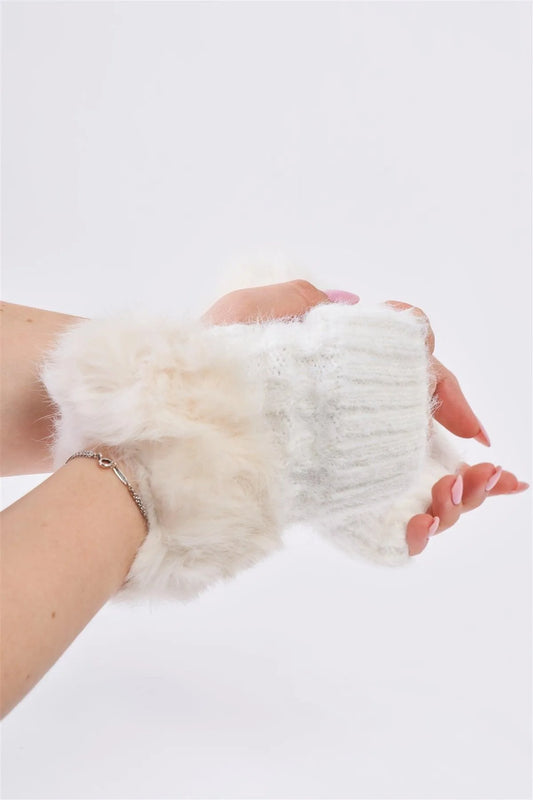 White Woven Furry Fingerless Two-Way Winter Gloves /3 PiecesVendor:Fame