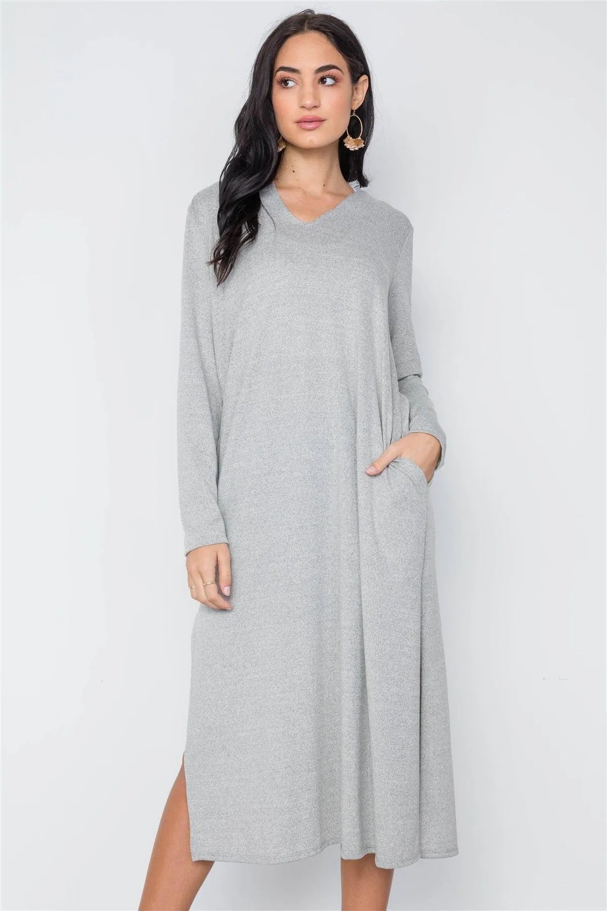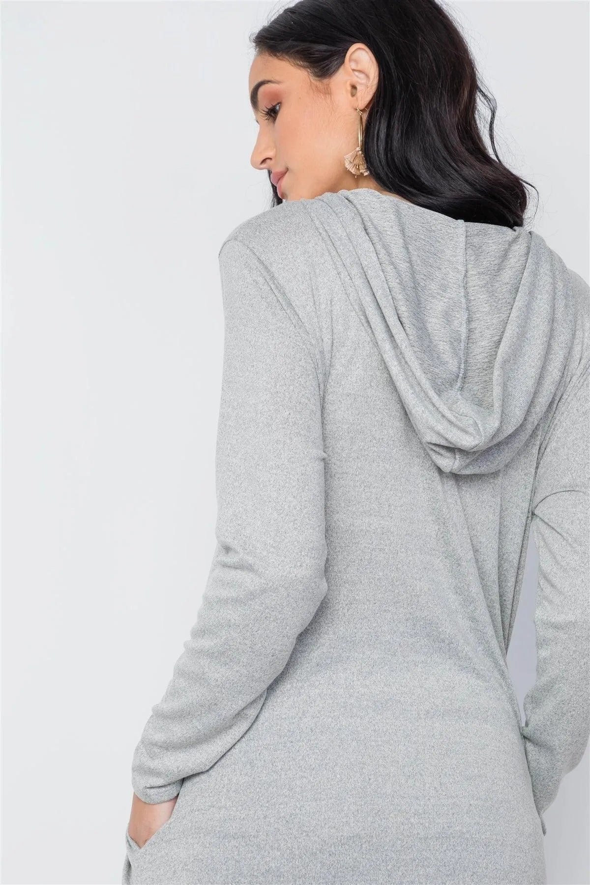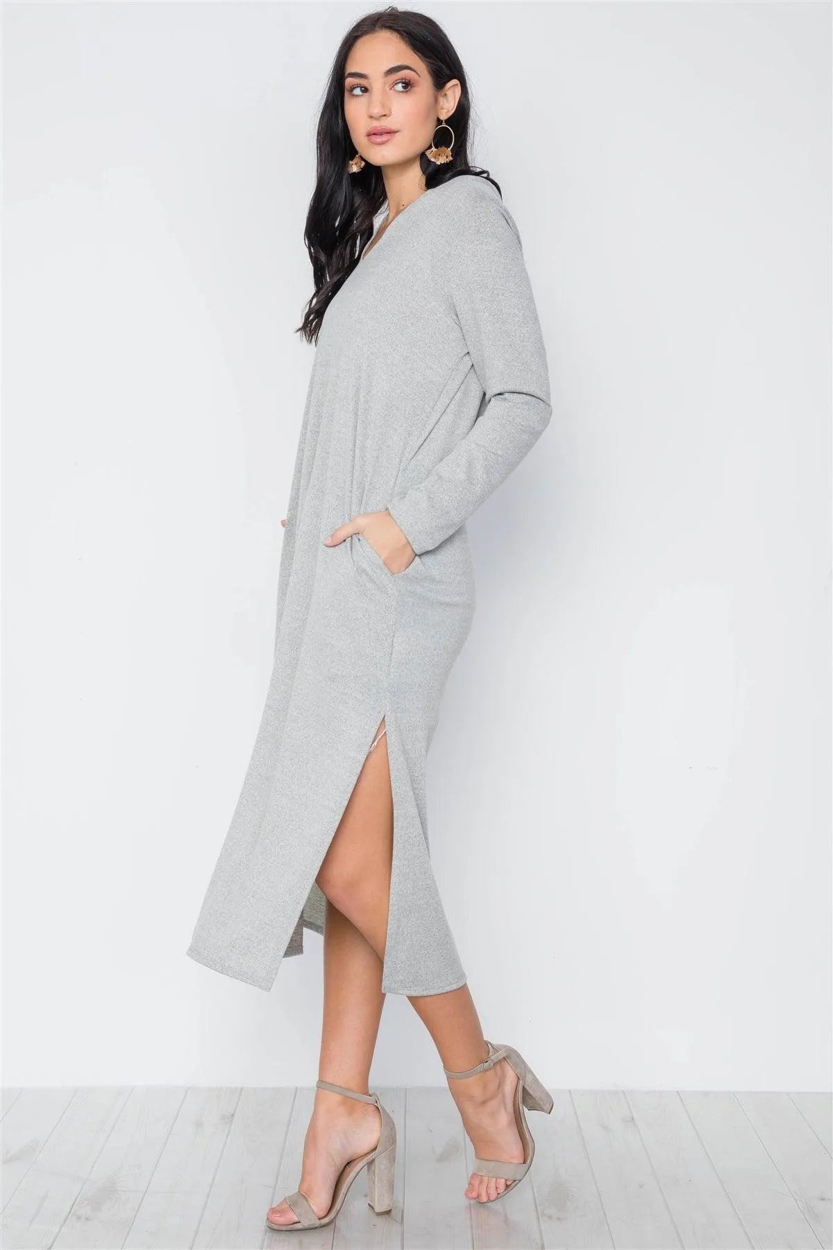 Grey Knit Long Sleeve V-Neck Hooded Midi Sweater Dress /2-1