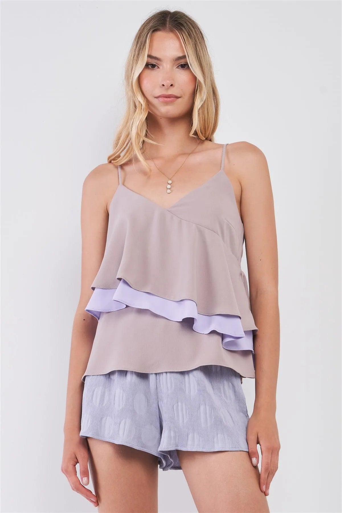 Grey & Lavender Asymmetric Layered Sleeveless V-Neck Flounce Top /1-2-2-1