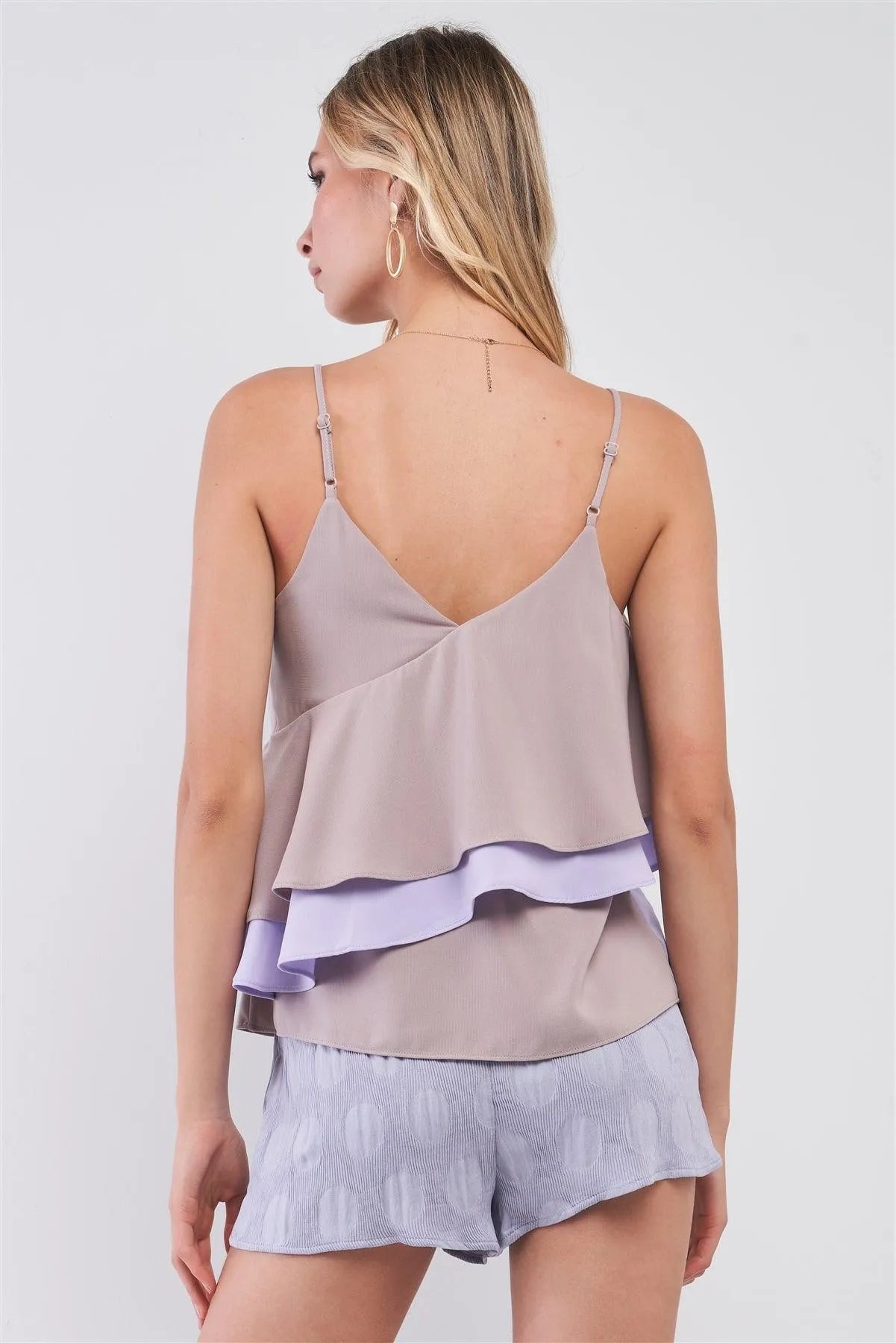 Grey & Lavender Asymmetric Layered Sleeveless V-Neck Flounce Top /2-3-1