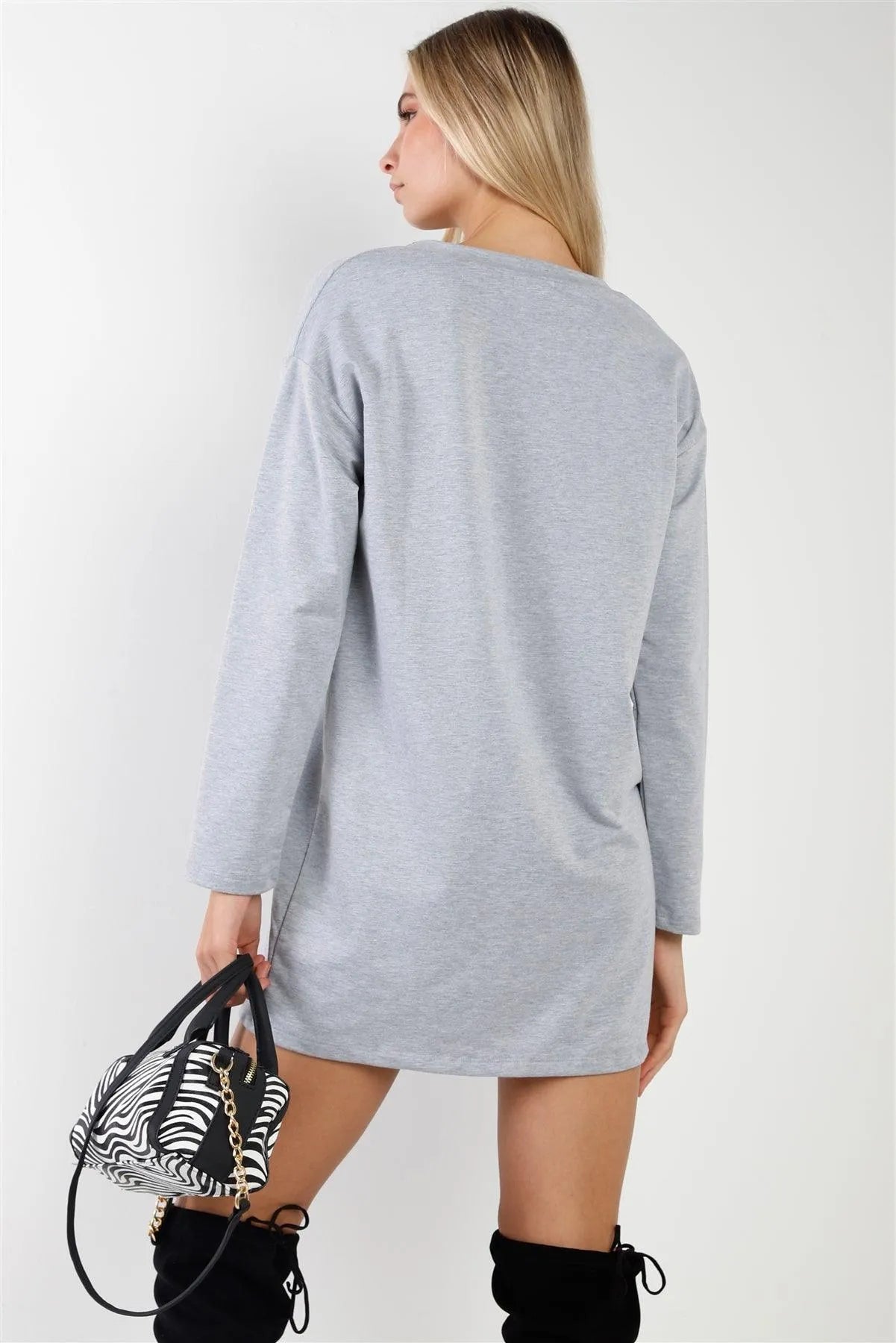 🖤 Item features: Heather grey, long sleeves, v-neck with graphic trim and lace up string, mini length, relaxed fit, non-stretchy, comfy, cozy, soft to touch, casual, basic, street style