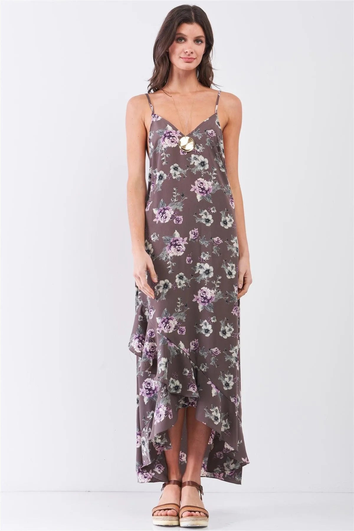 🖤 Item features: Grey, multi, floral print, sleeveless, adjustable straps, v-neck, asymmetrical wrap at the bottom, ruffle trim, maxi length, side hidden zipper closure, unlined, non-sheer, non-stretch, loose fit, slip dress, date look, girly, cute, spring/summer collection