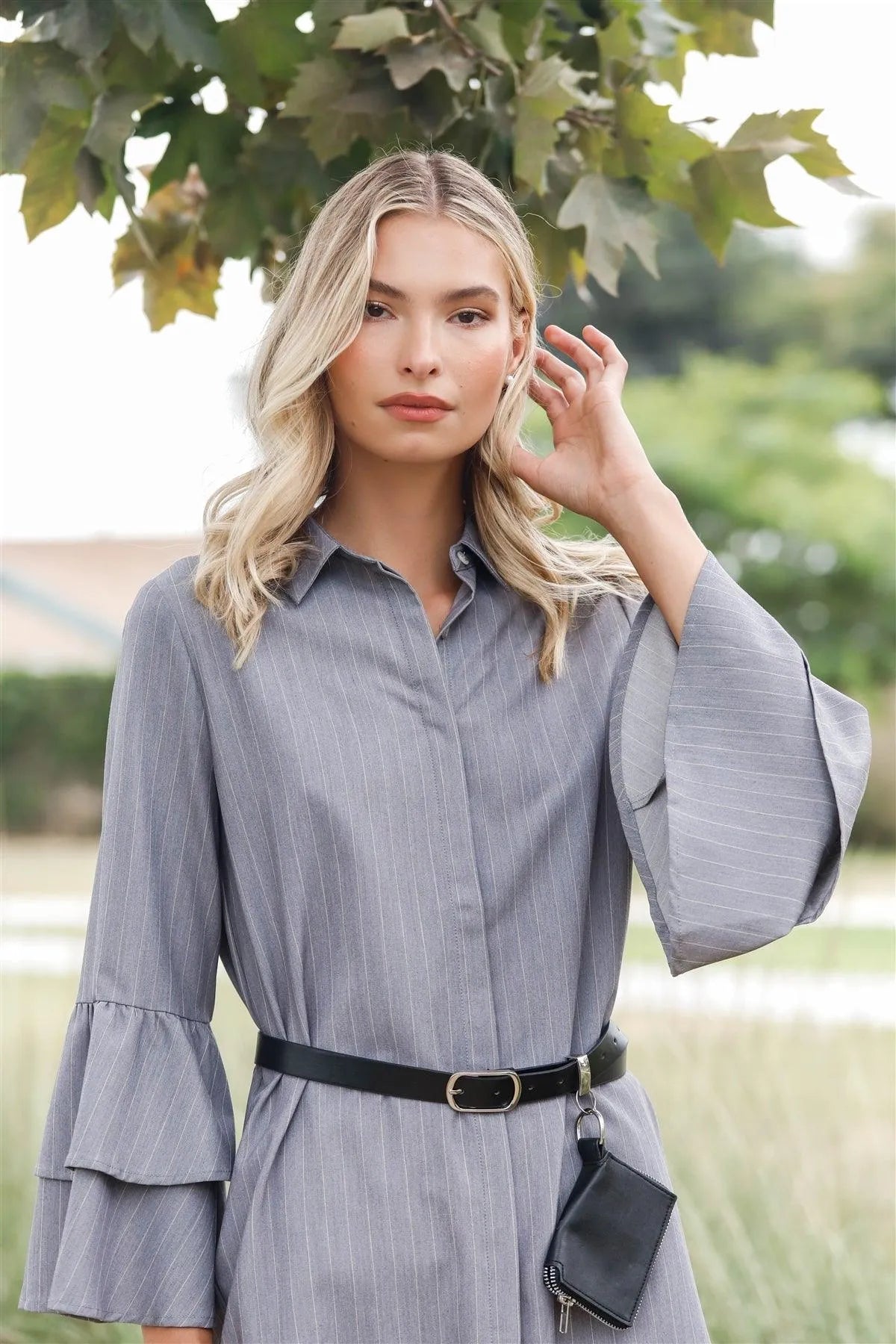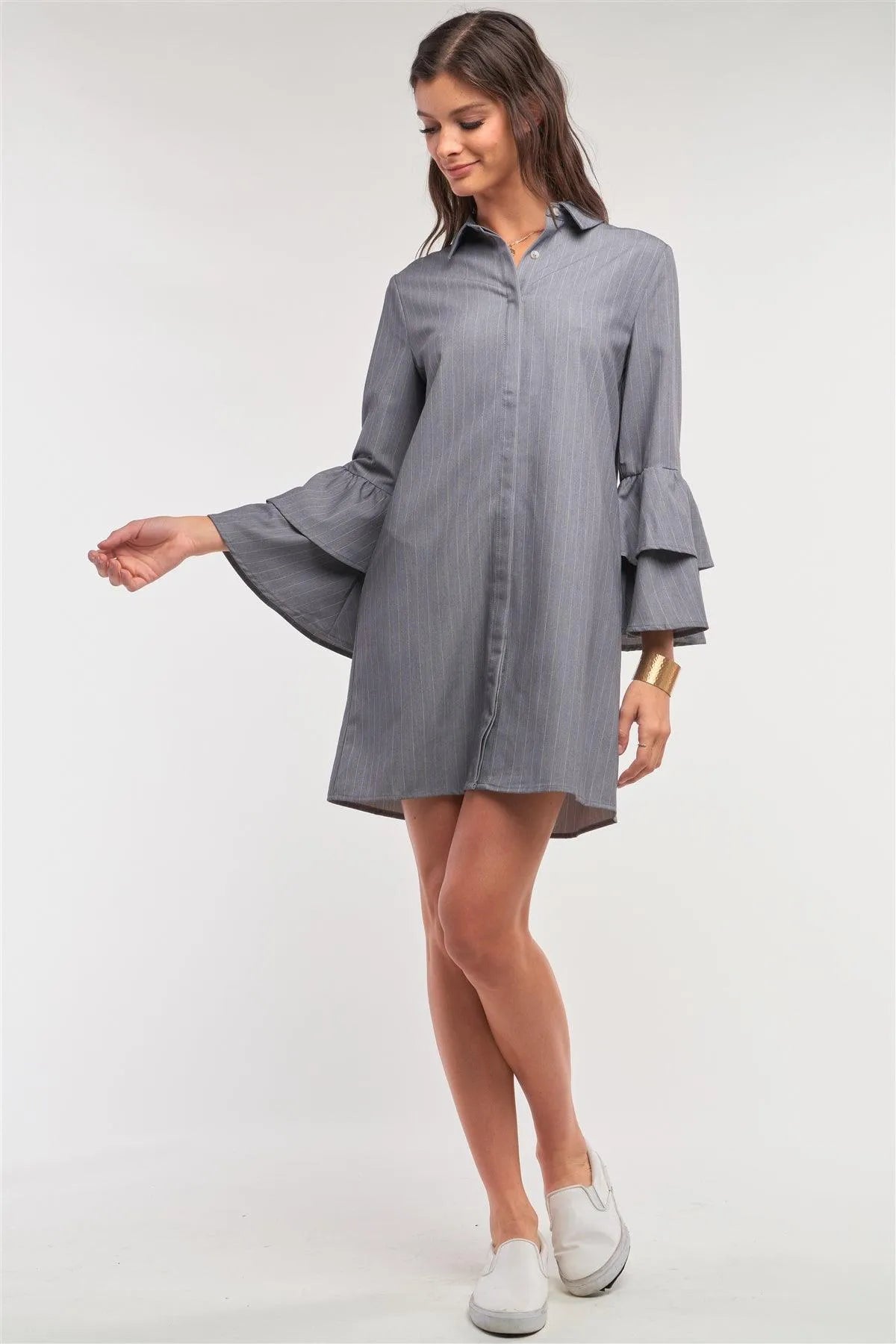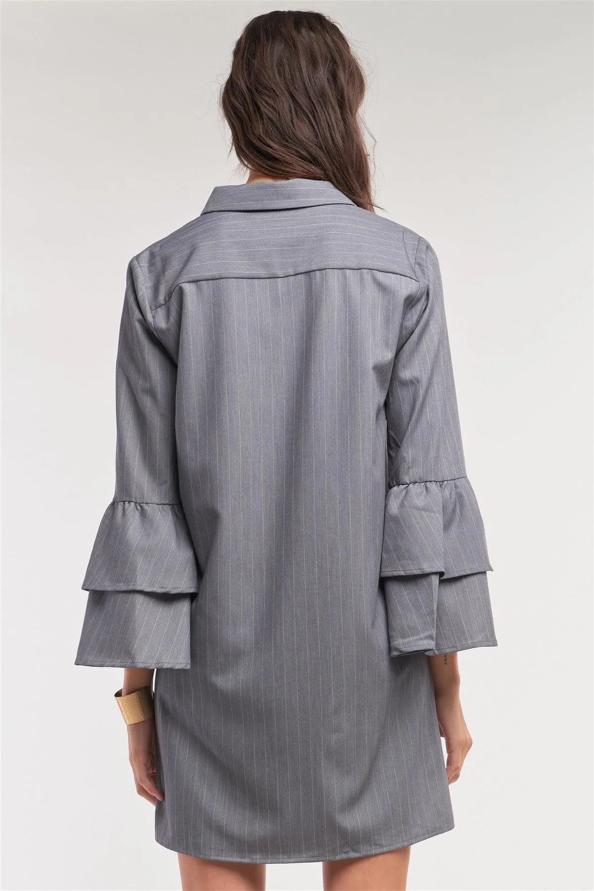 Grey Pinstriped Relaxed Button Down Long Flare Sleeve Shirt Mini Dress /1-2-2-1