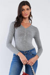 Solid Heather Grey Long Sleeve Ribbed Snap Button Down Hem V-Neck Bodysuit /3-3