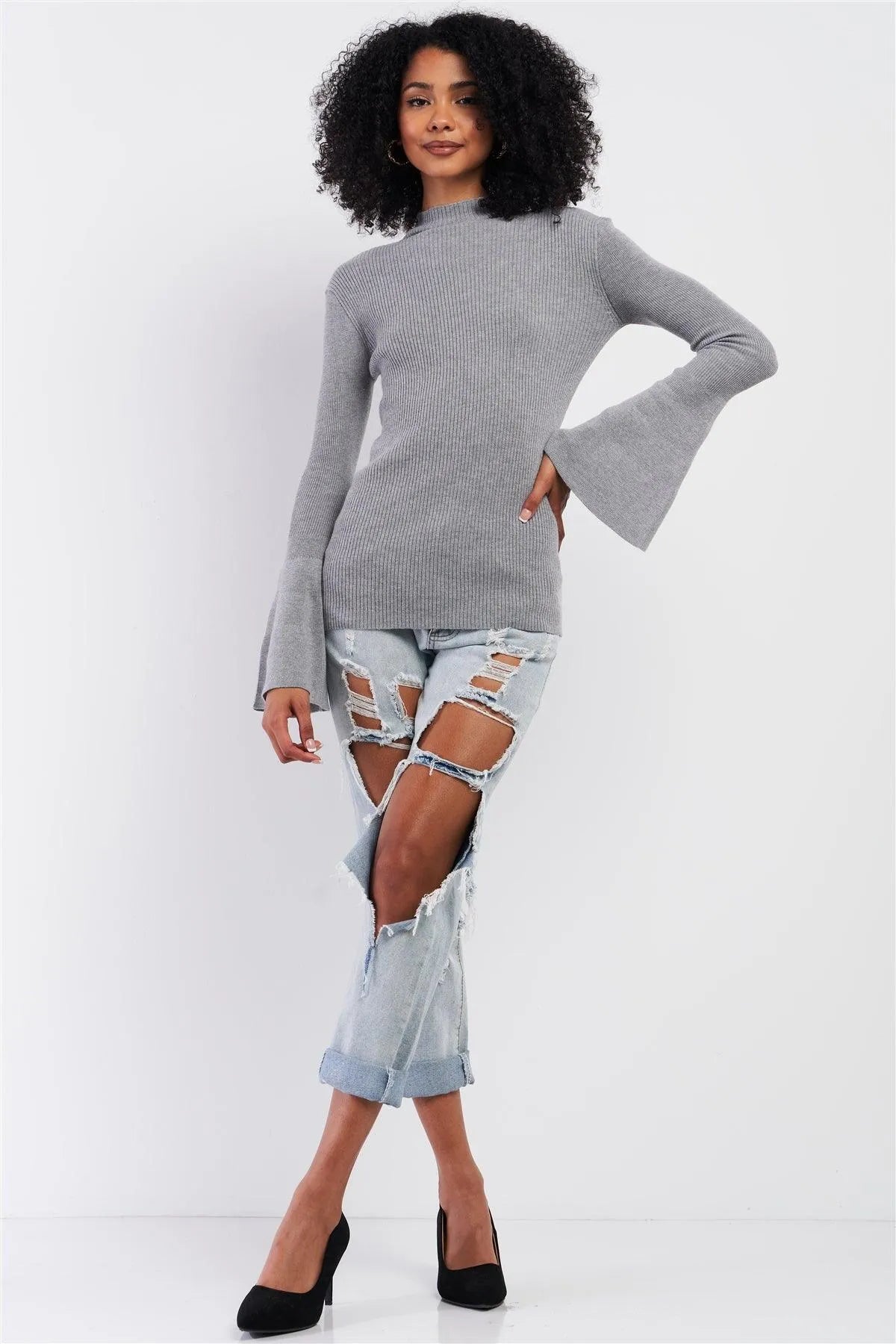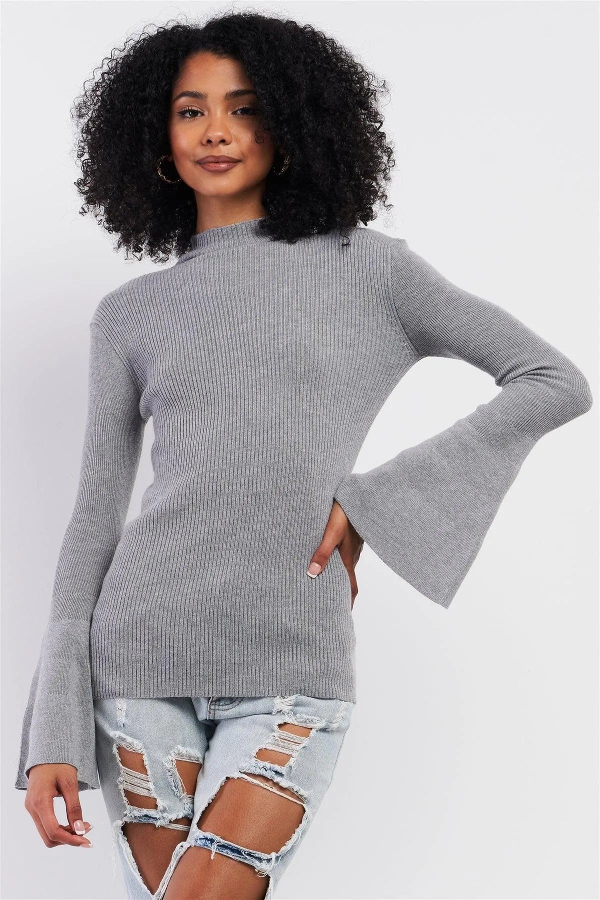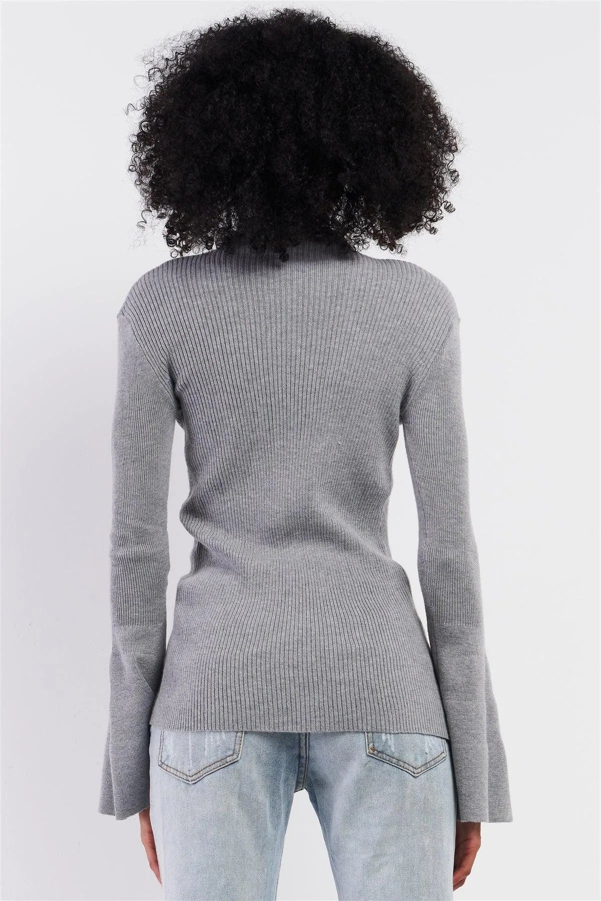 Grey Ribbed Semi-Turtleneck Long Trumpet Sleeve Fitted Sweater /3-3