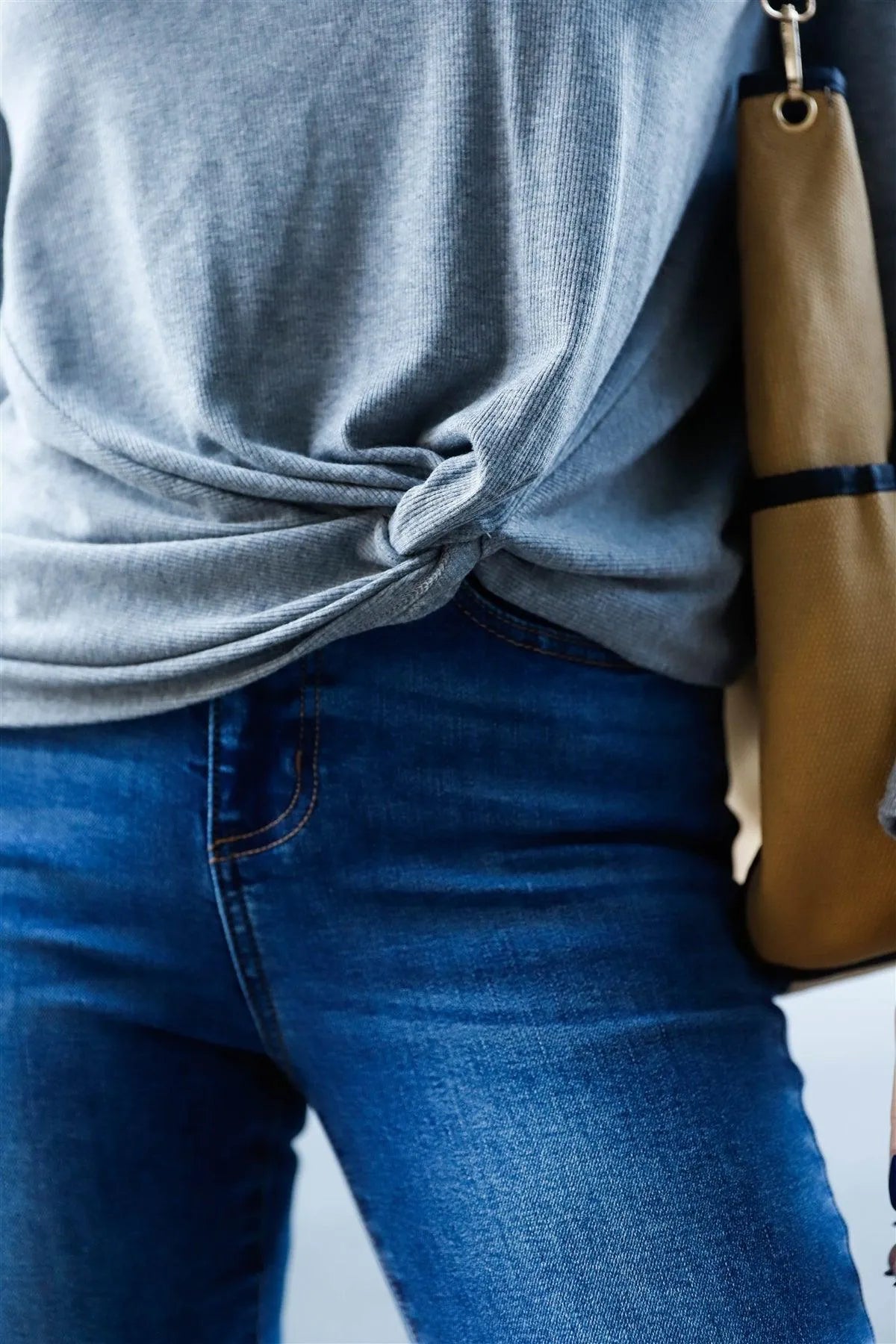 Grey Ribbed Twist Front Detail Long Sleeve Top /1-2-2-1