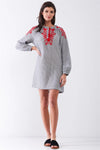 Grey Striped Long Balloon Sleeve Slavic Pattern Embroidery Relaxed Mini Dress /2-1-2
