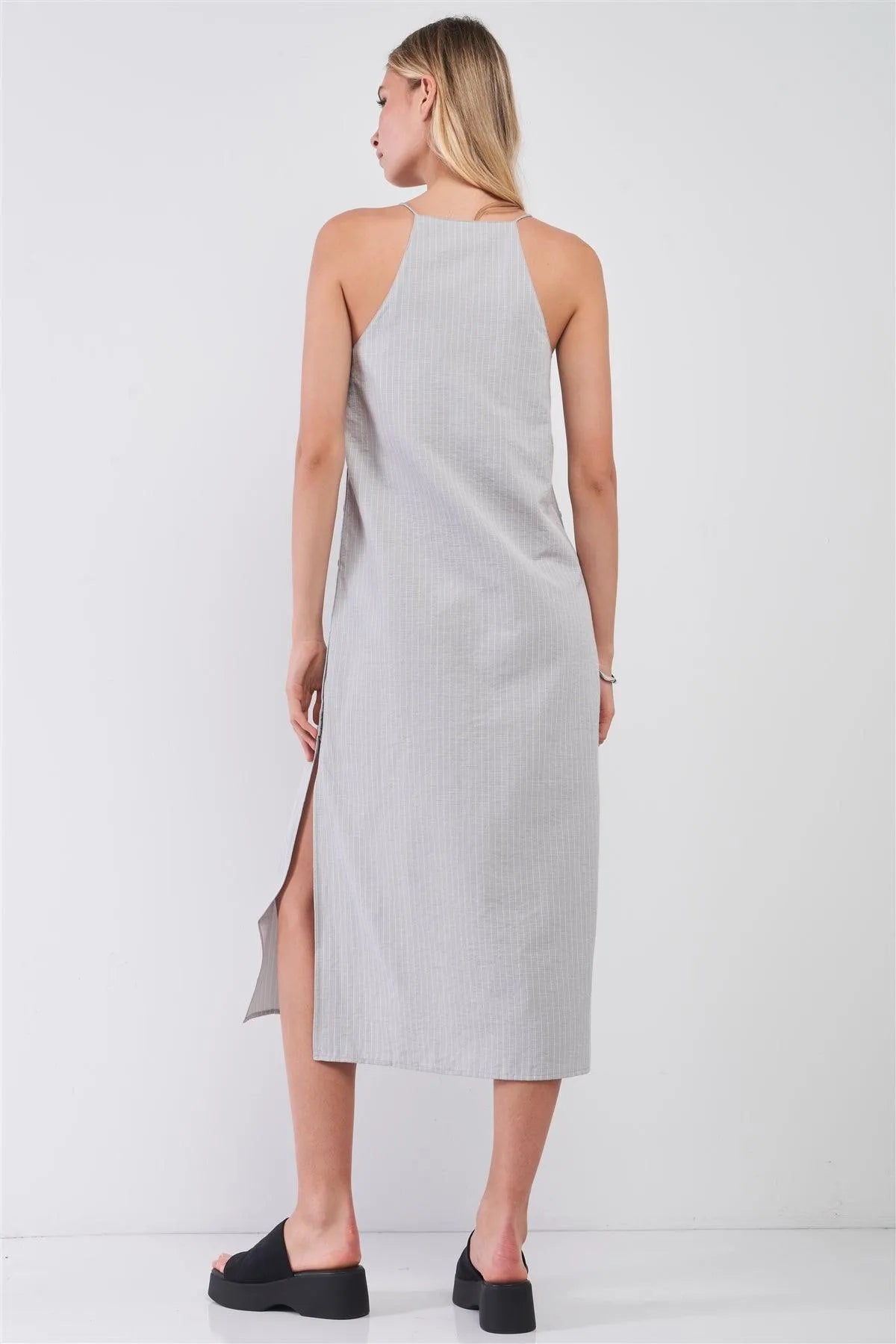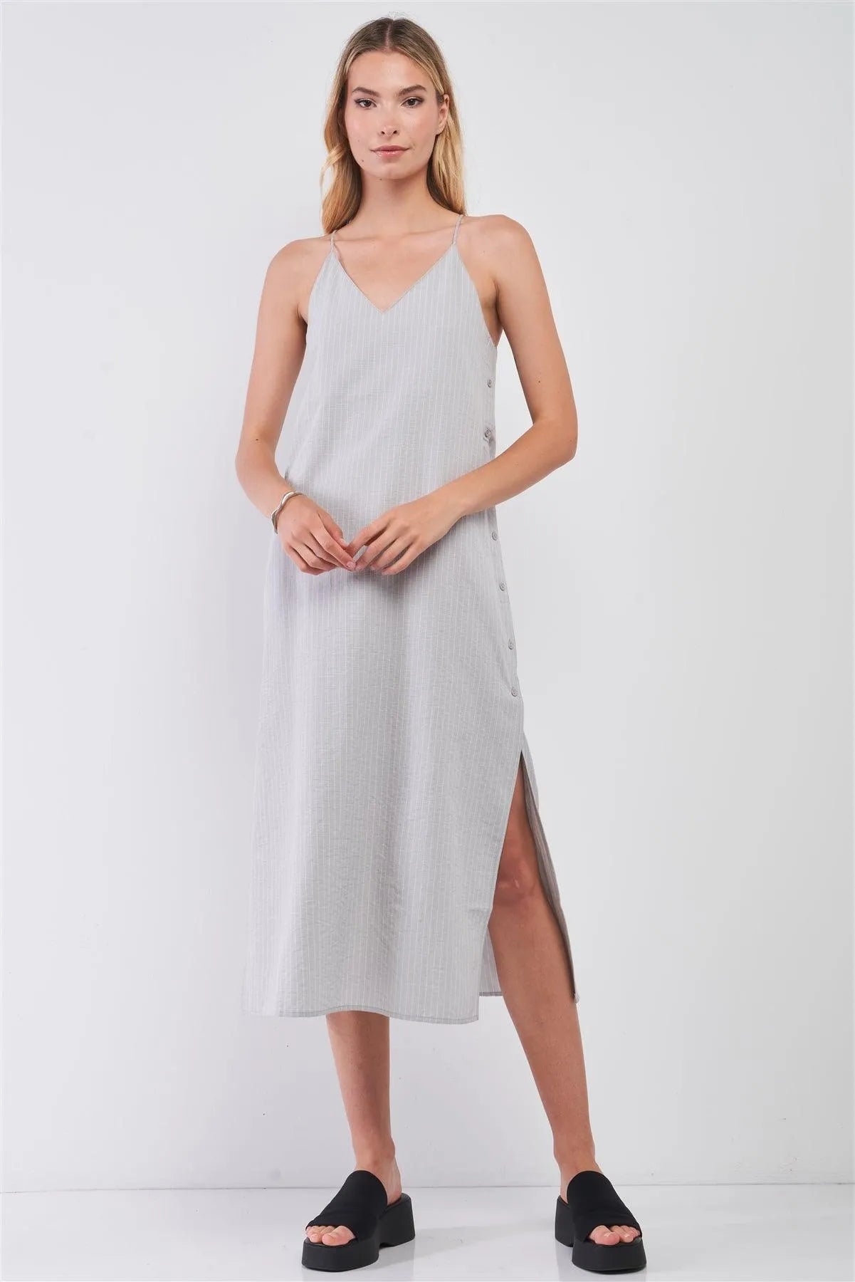 Grey Striped Sleeveless V-Neck Button-Down Slit Sides Detail Midi Dress /1-2-2-1