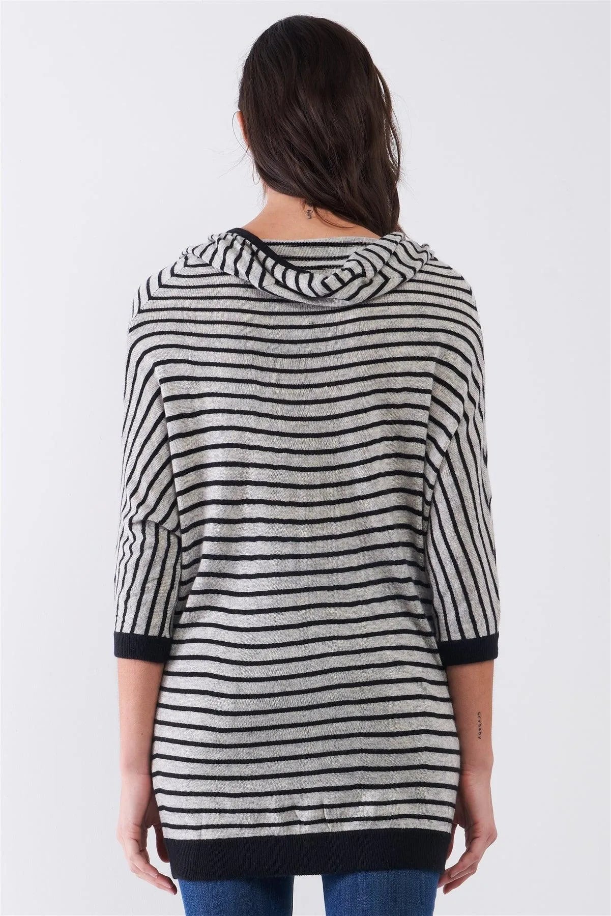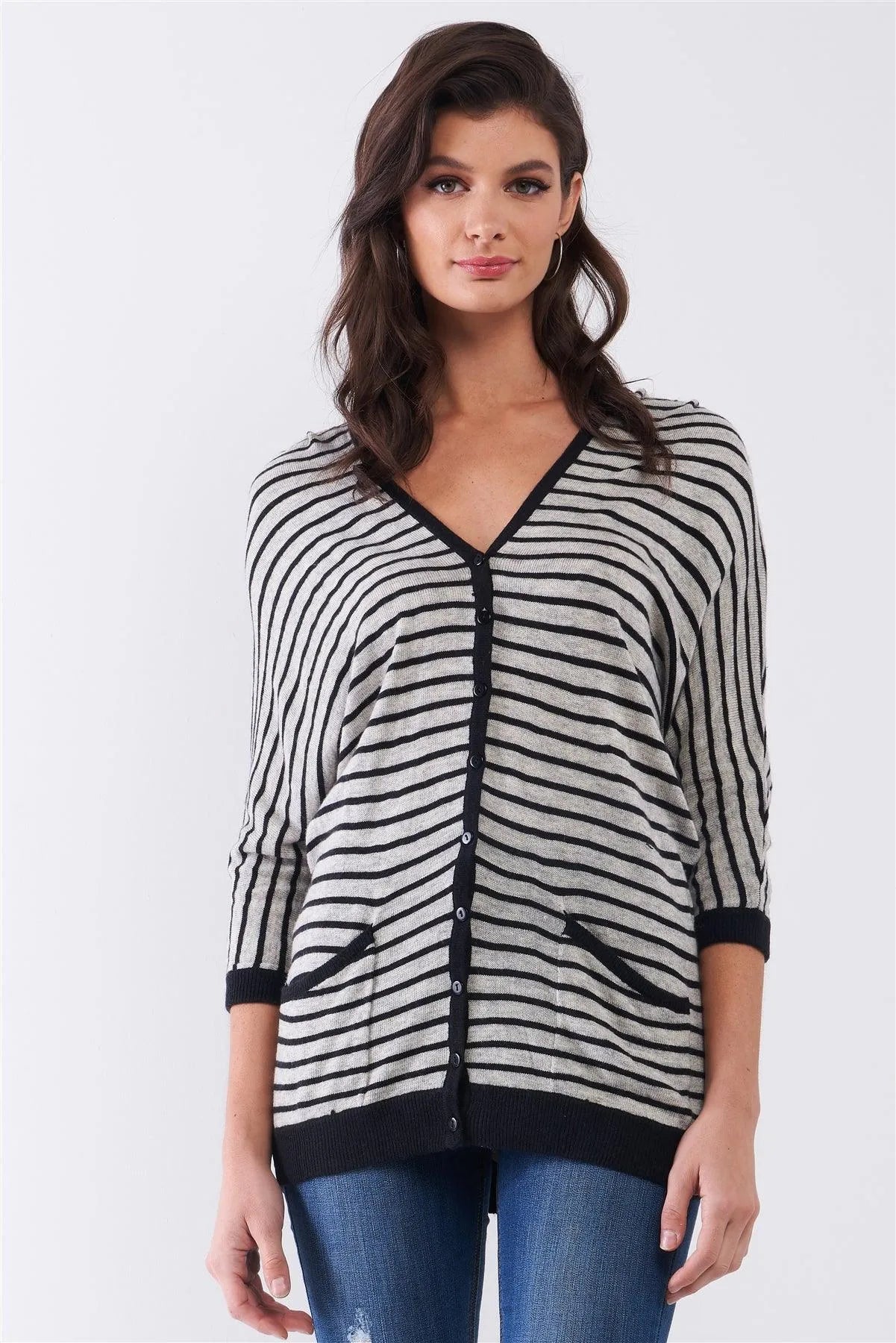 Grey Striped Button-Up Front Midi Sleeve Relaxed Cardigan Top /1-2-1