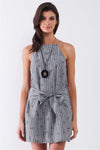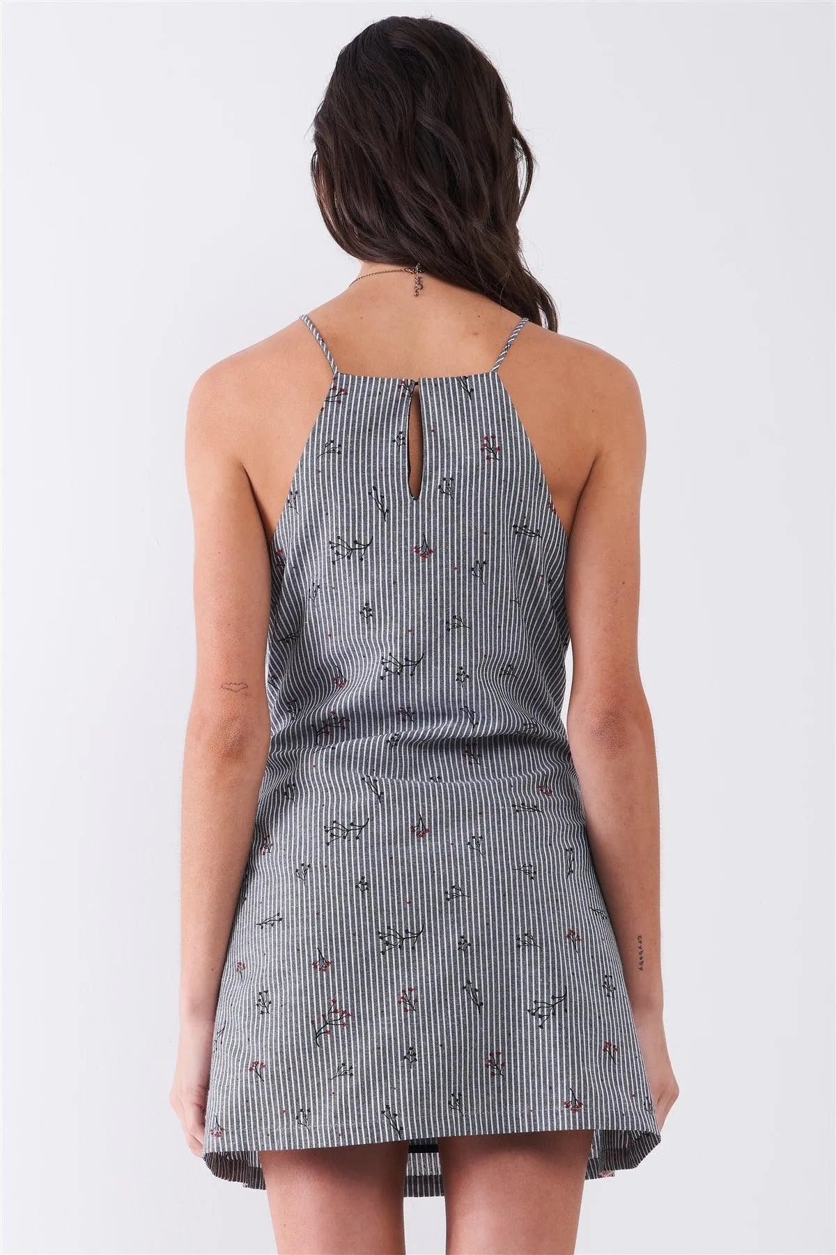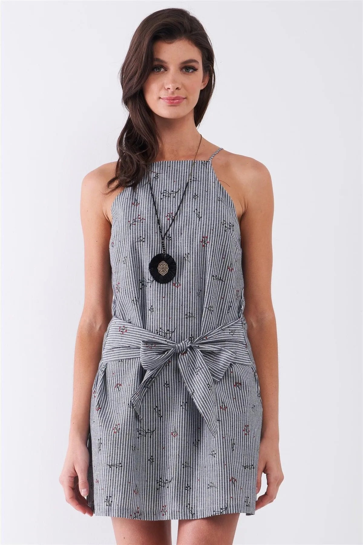 Grey Striped Sleeveless Floral Print High Neck Self-Tie Waist Mini Dress /1-2-2-1