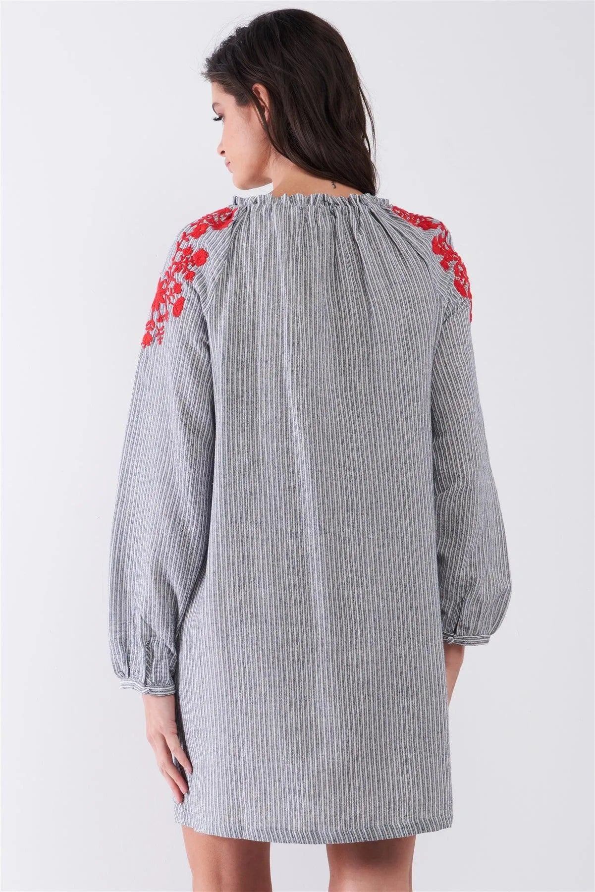 Grey Striped Long Balloon Sleeve Slavic Pattern Embroidery Relaxed Mini Dress /1-2-2-1
