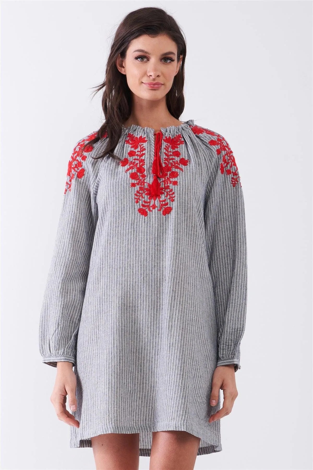 🖤Item Features: Grey, striped, red Slavic pattern embroidery detail, frill tassel tip self-tie strings neckline, long balloon sleeve, relaxed fit, unlined, mini length, non-stretch, casual, boho, breathable, comfy, spring/summer collection