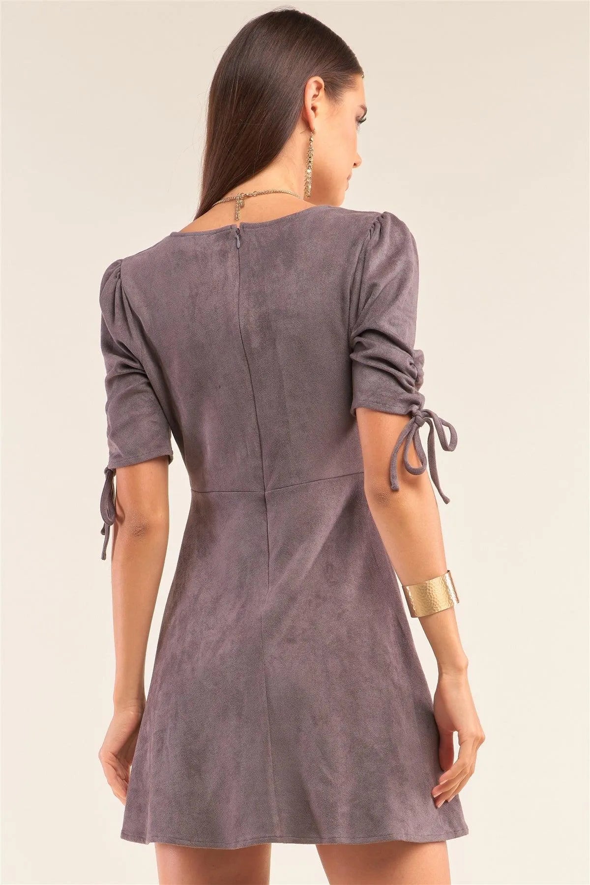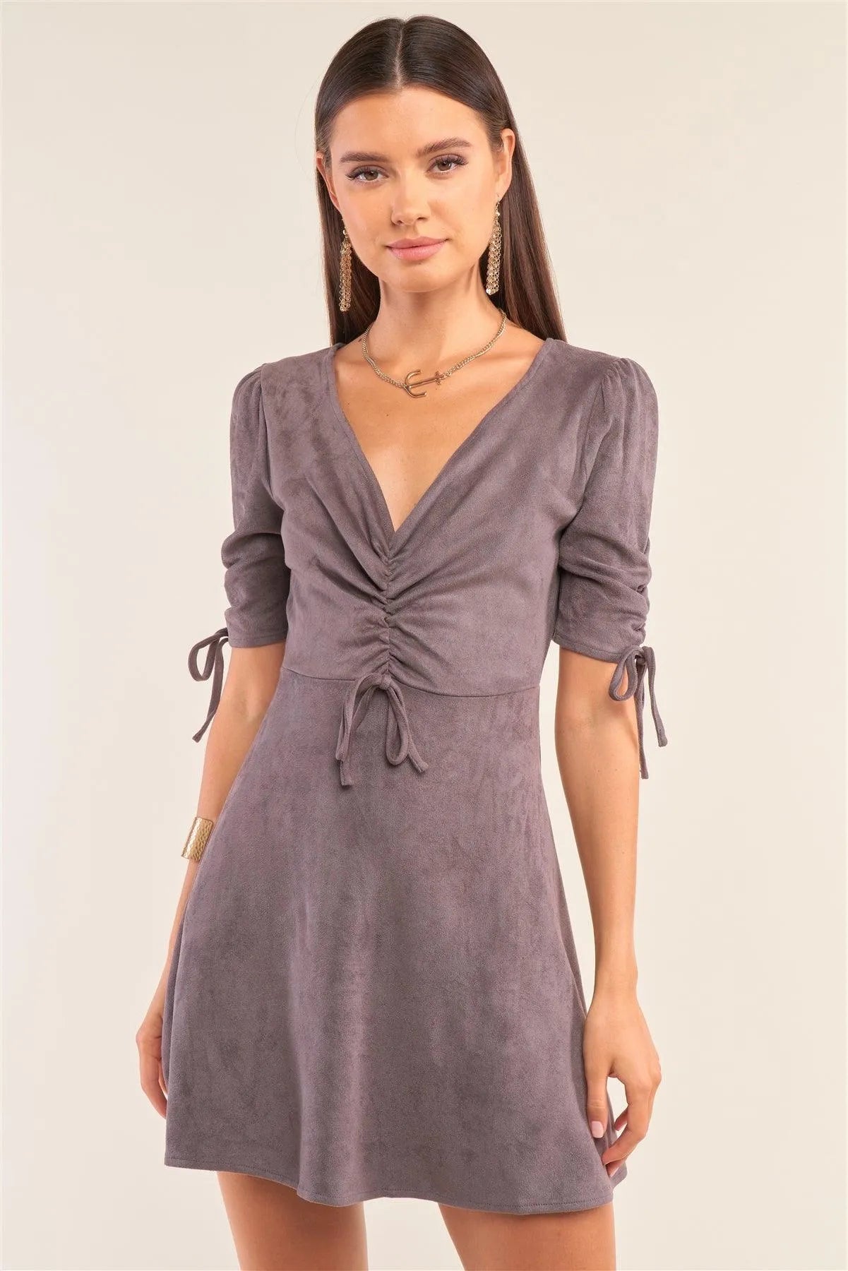Charcoal Grey Suede Deep Plunge V-Neck Gathered Detail Tight Fit Mini Dress /1-2-2-1