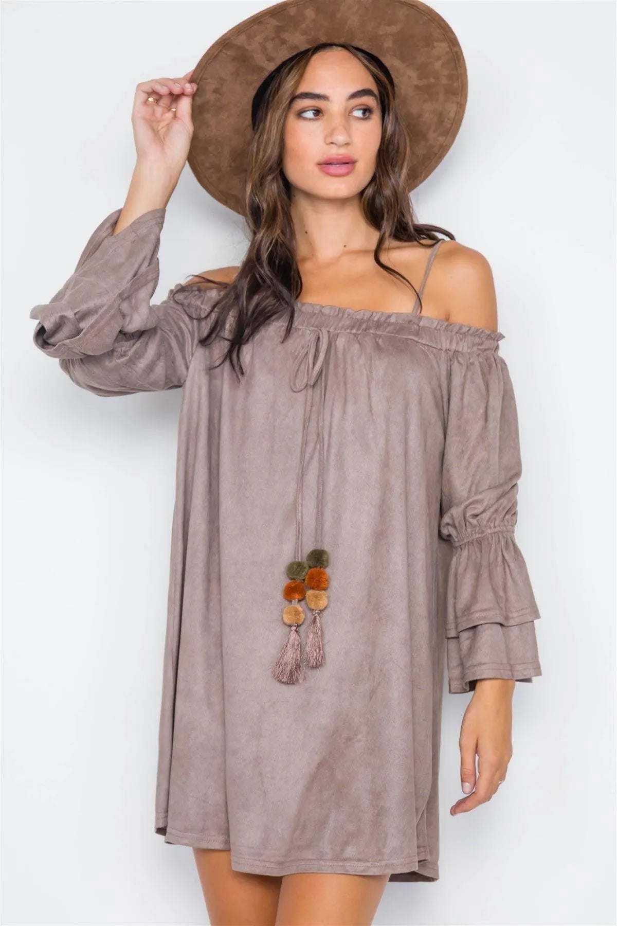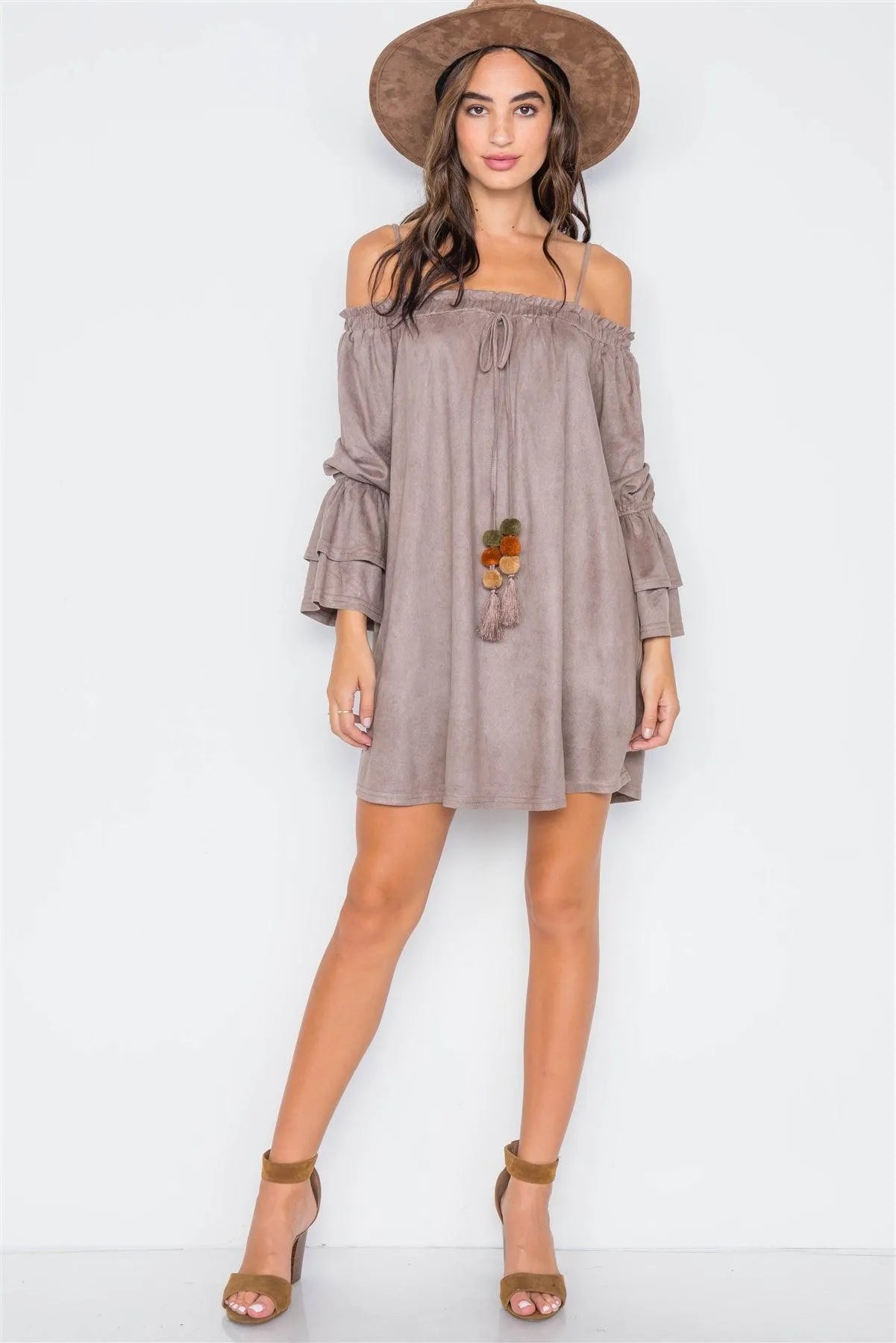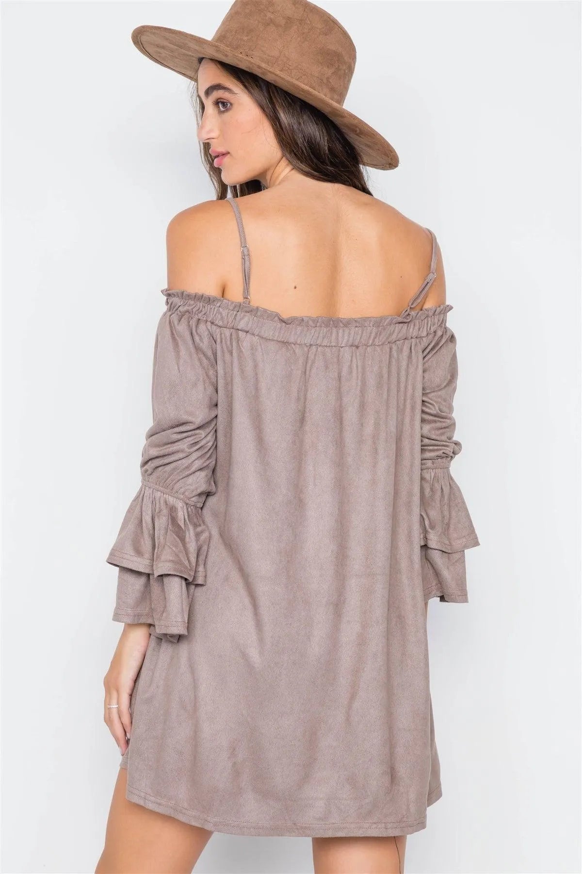 Grey Taupe Faux Suede Off-The-Shoulders Mini Dress