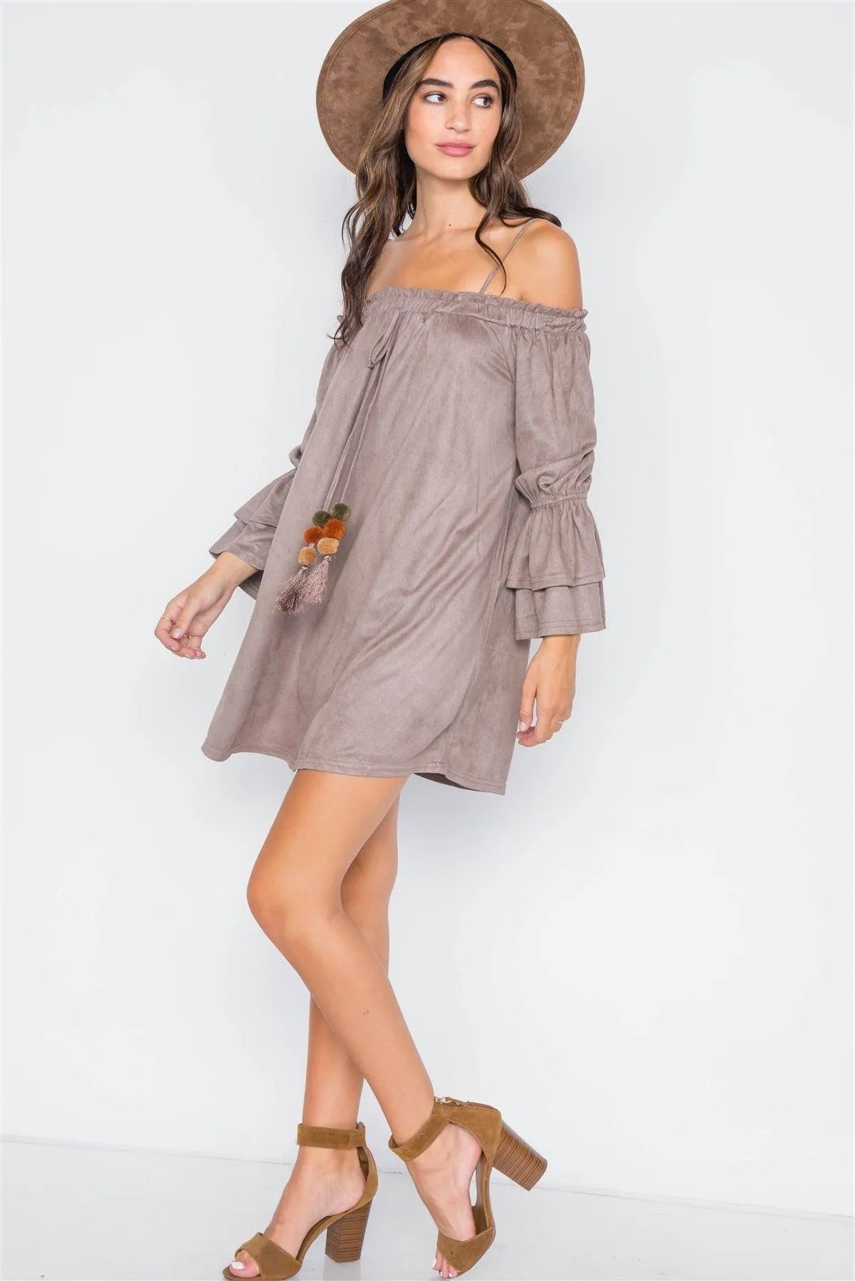 Grey Taupe Faux Suede Off-The-Shoulders Mini Dress / 2-2-2