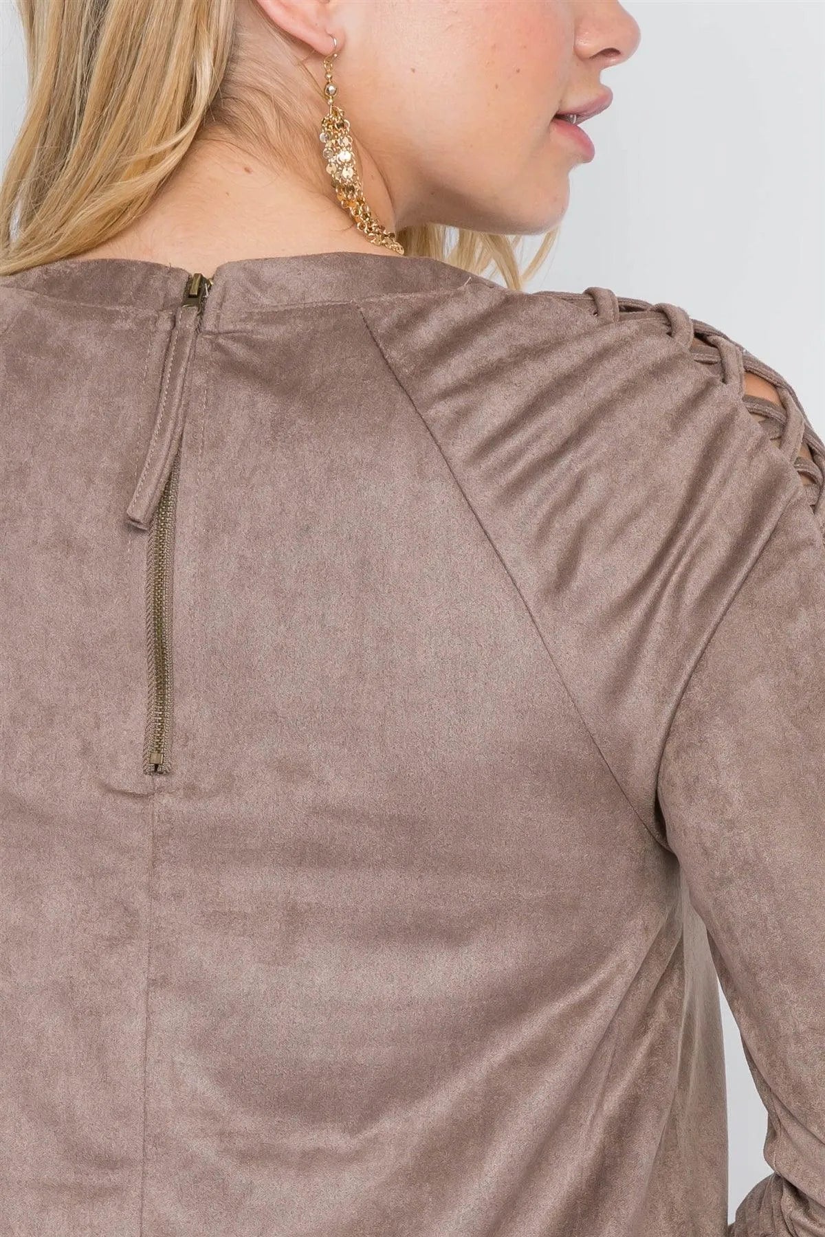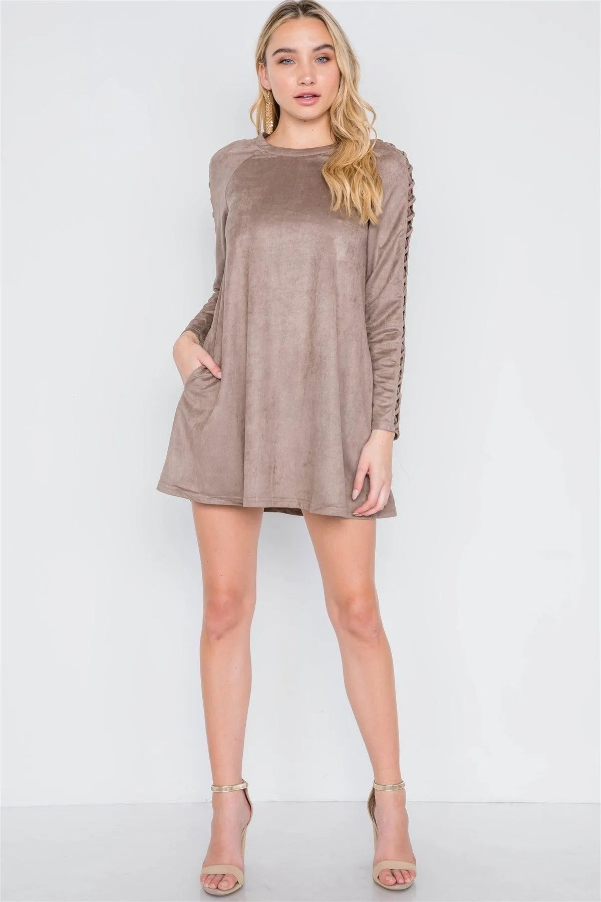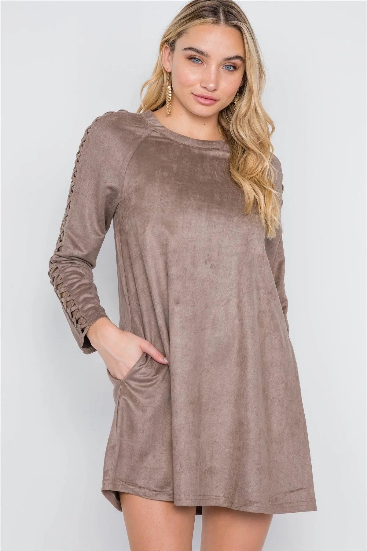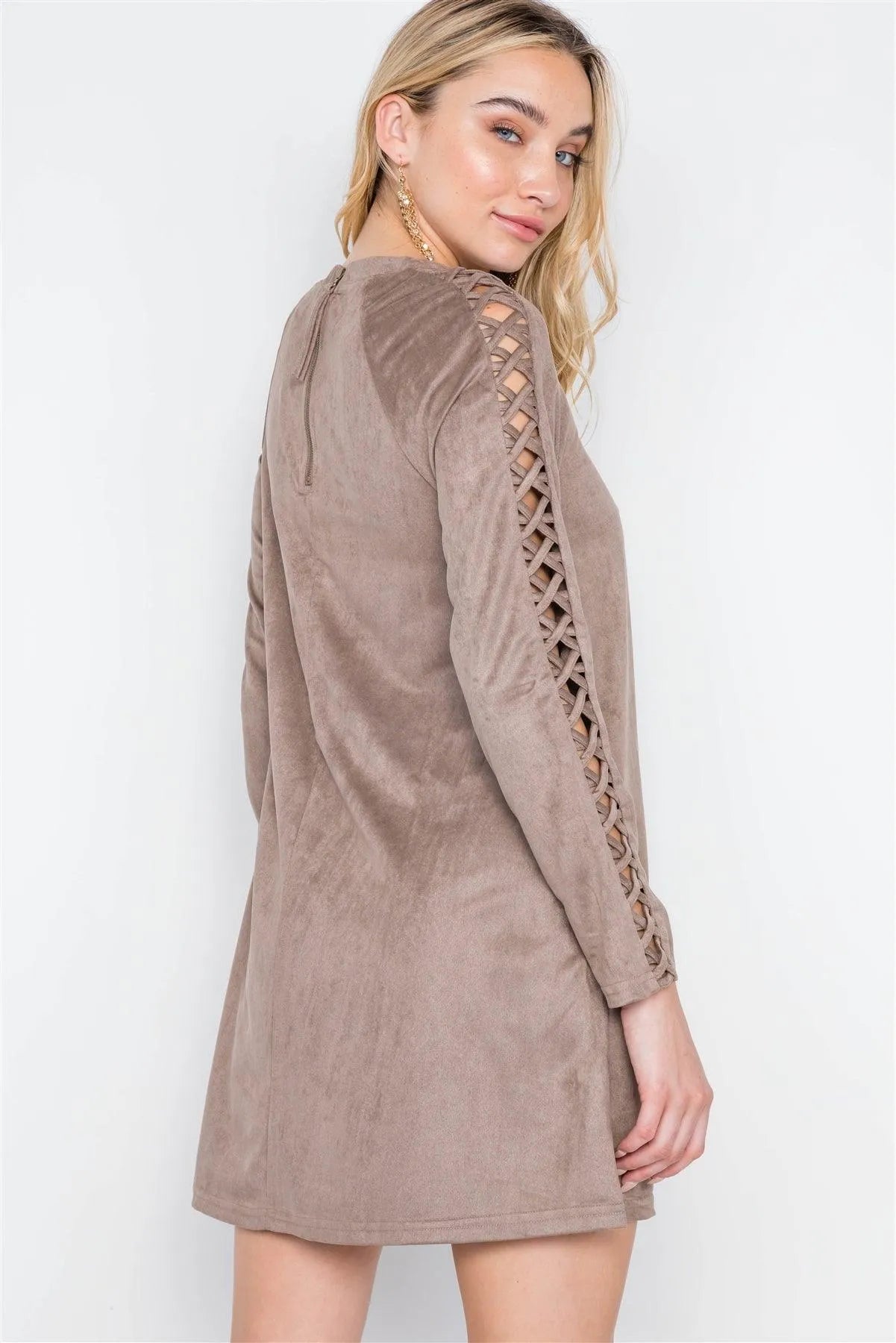 Grey Taupe Faux Suede Strap Sleeves Mini Shirt Dress /2-2-2