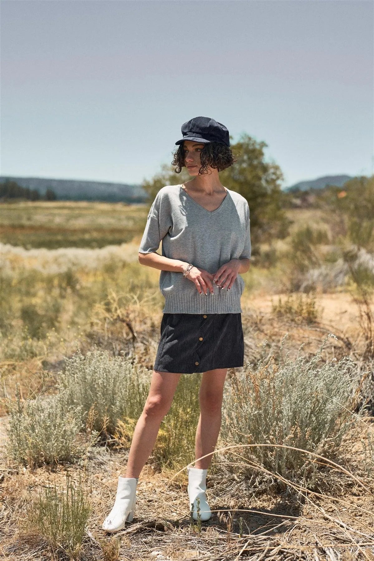 Grey V-Neck Short Sleeve Loose Fit Rib Hem Knit Top /1-2-2-1-1
