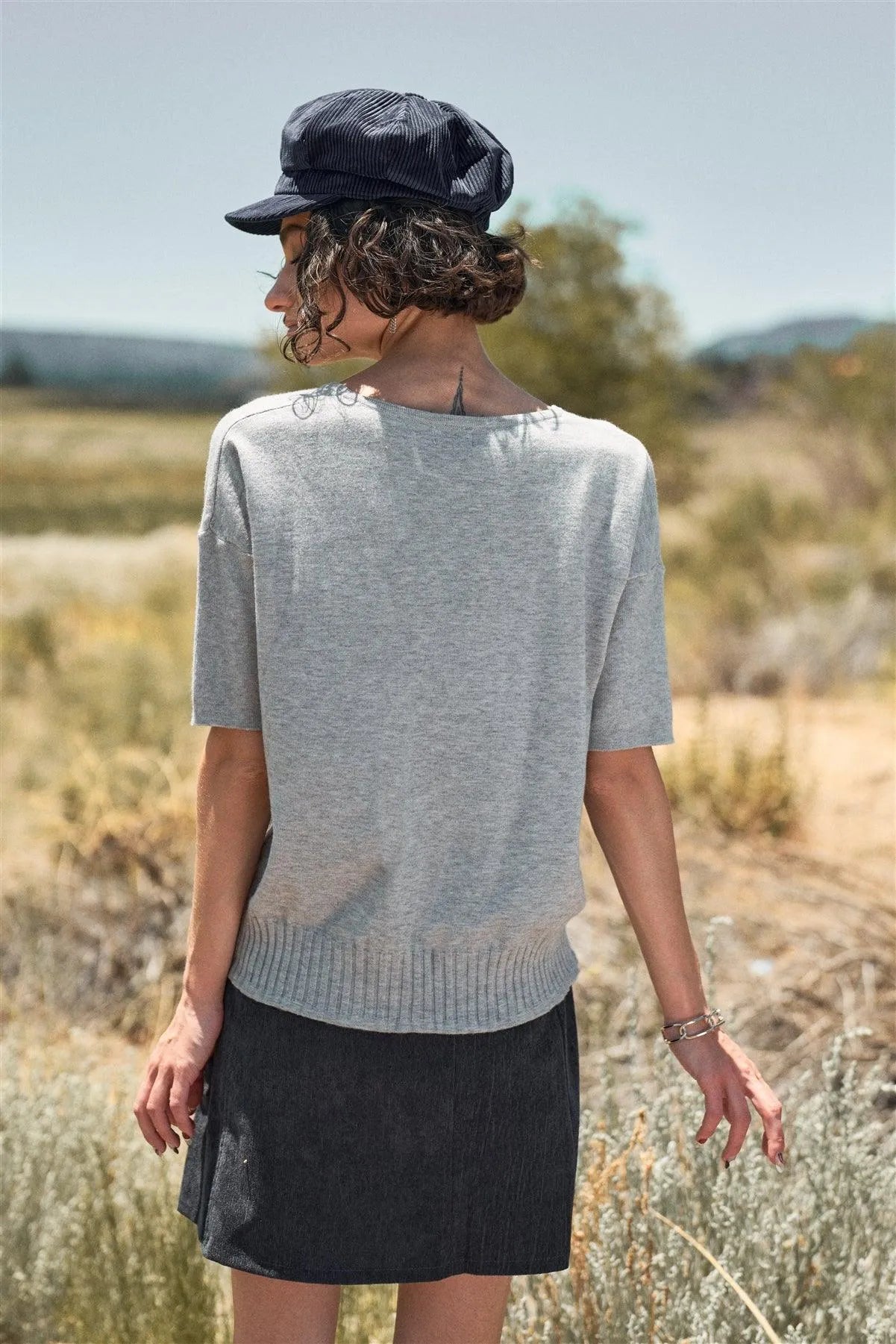Grey V-Neck Short Sleeve Loose Fit Rib Hem Knit Top