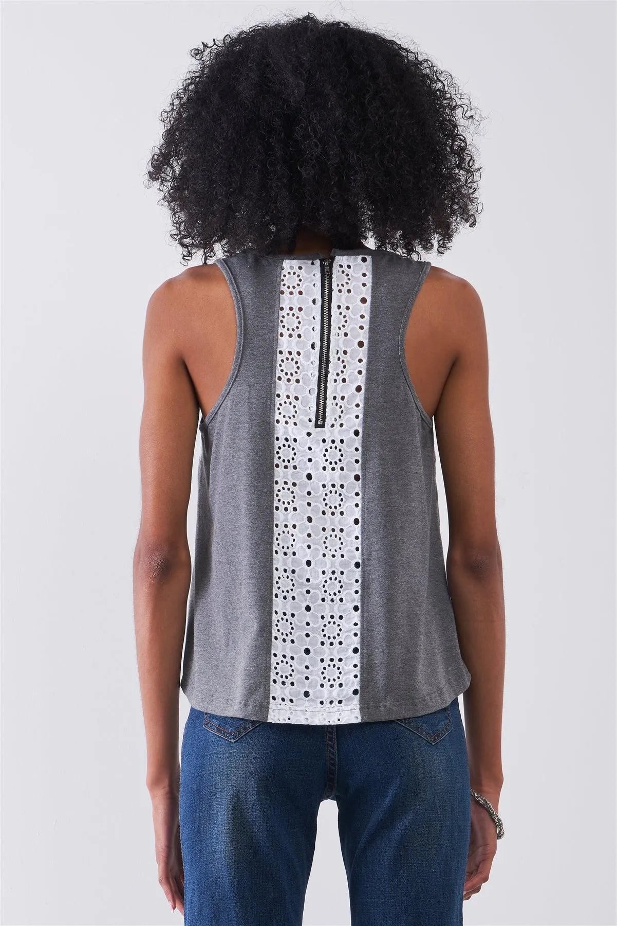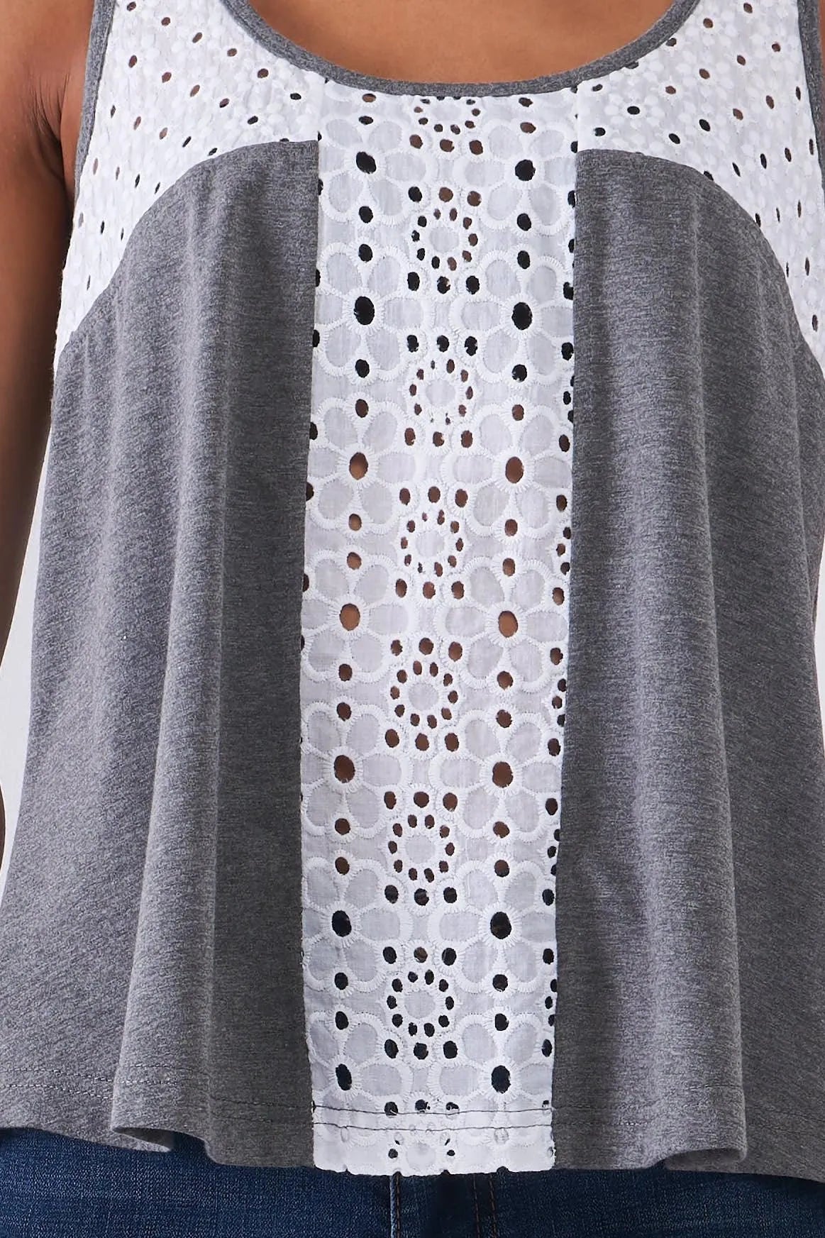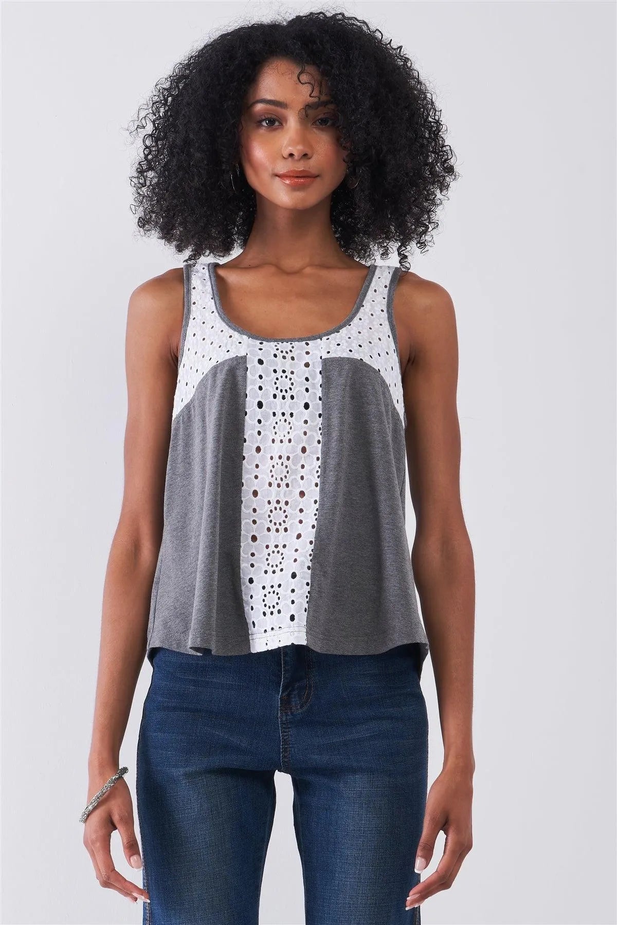 Grey & White Sheer Crochet Trim Sleeveless Scoop Neck Relaxed Top /1-2-2-1