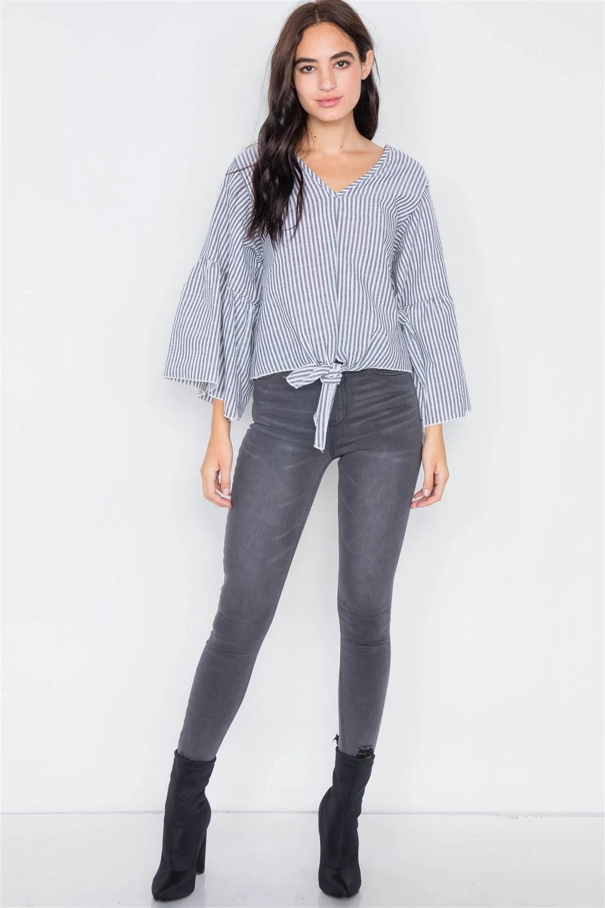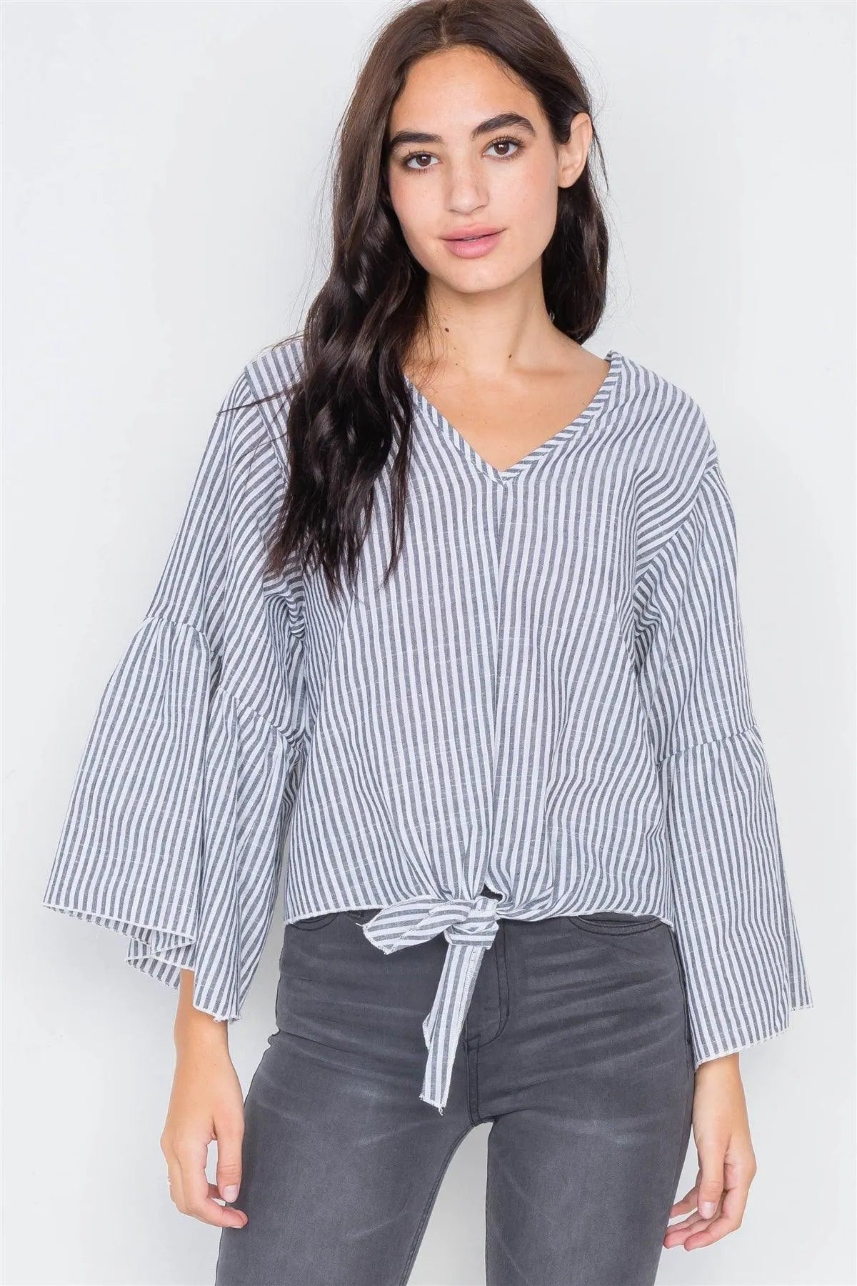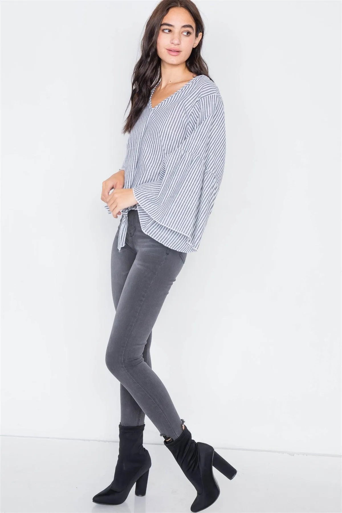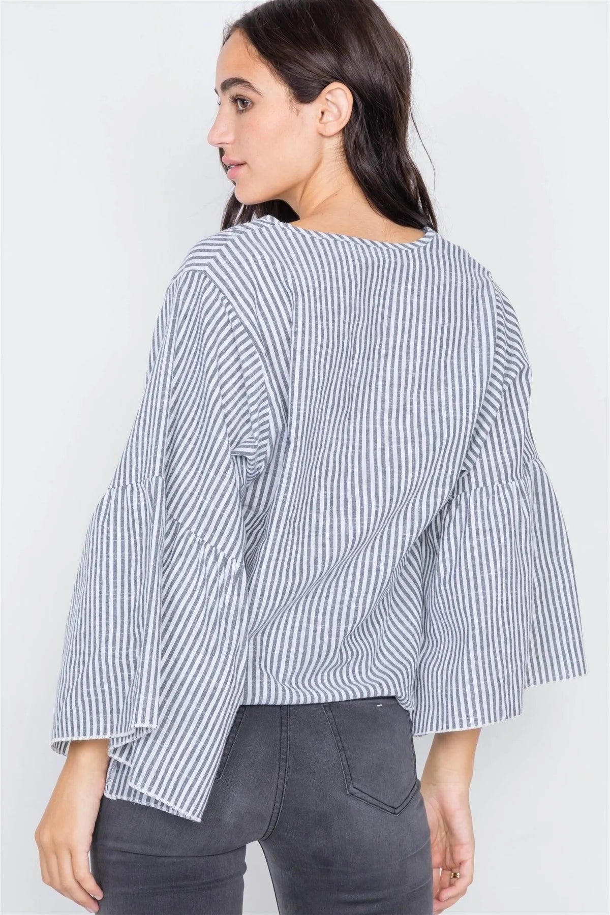 Grey & White Stripe V-Neck Cotton Bell Sleeve Top /2-2-2