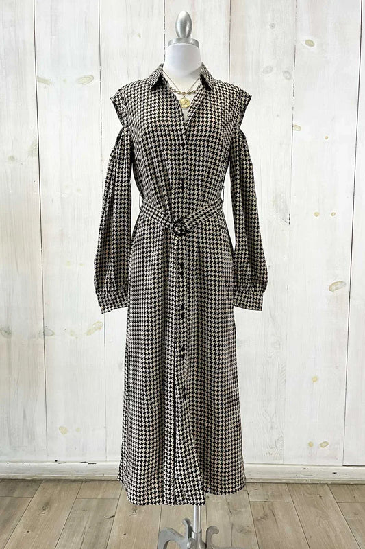 Houndstooth Print with Belt Cold Shoulder Long Sleeve Midi Maxi Shirt DressVendor:Reveuse