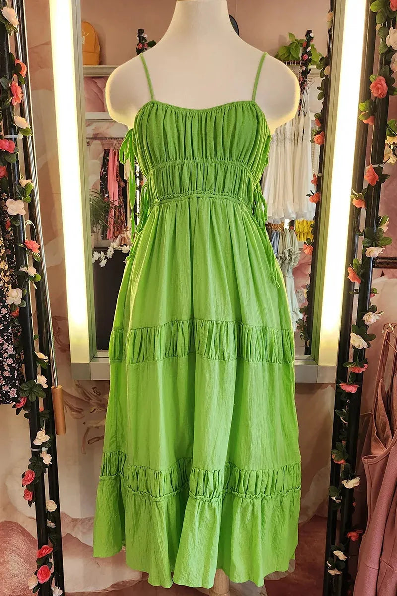 Lime Green Ruched Tiered Side Cut-Out Boho Summer Midi Dress