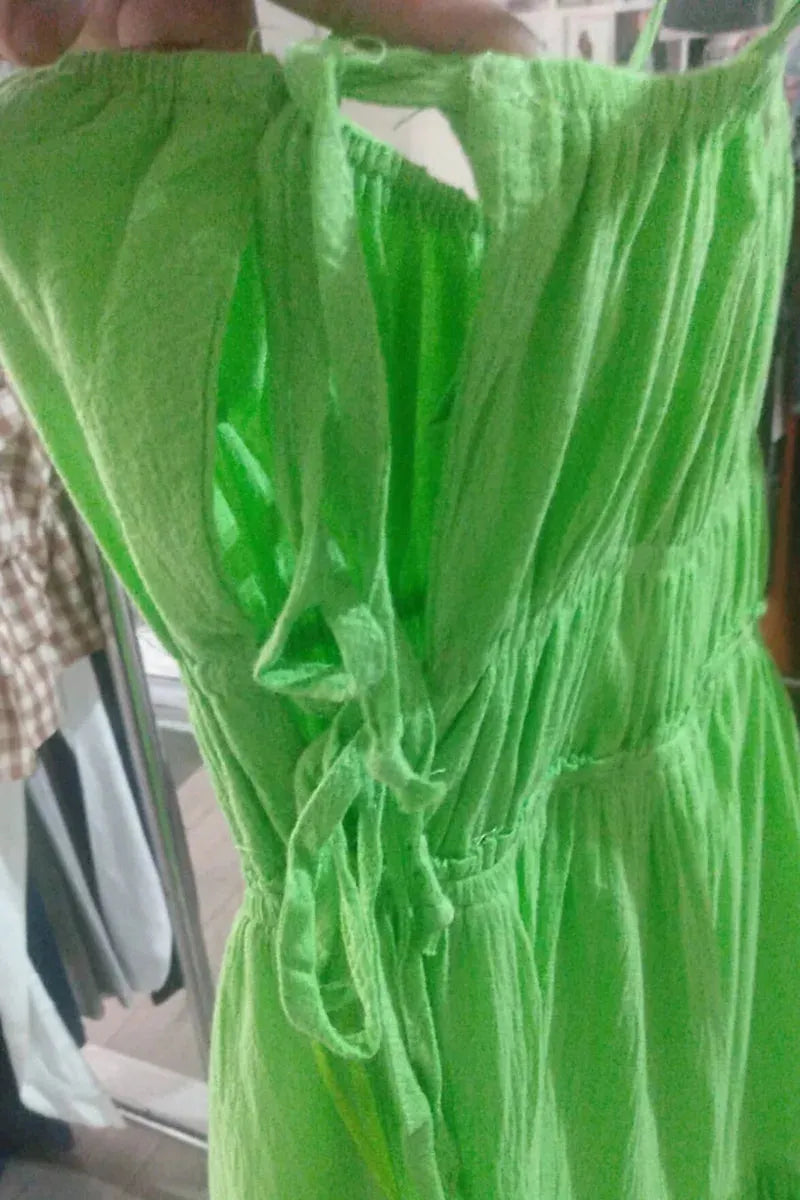 🖤 Features: Lightweight fabric, side cut-out design, adjustable tie closure, gathered bust detail, tiered ruffle construction, elastic waistband, breathable material, summer-ready silhouette, vibrant lime green color