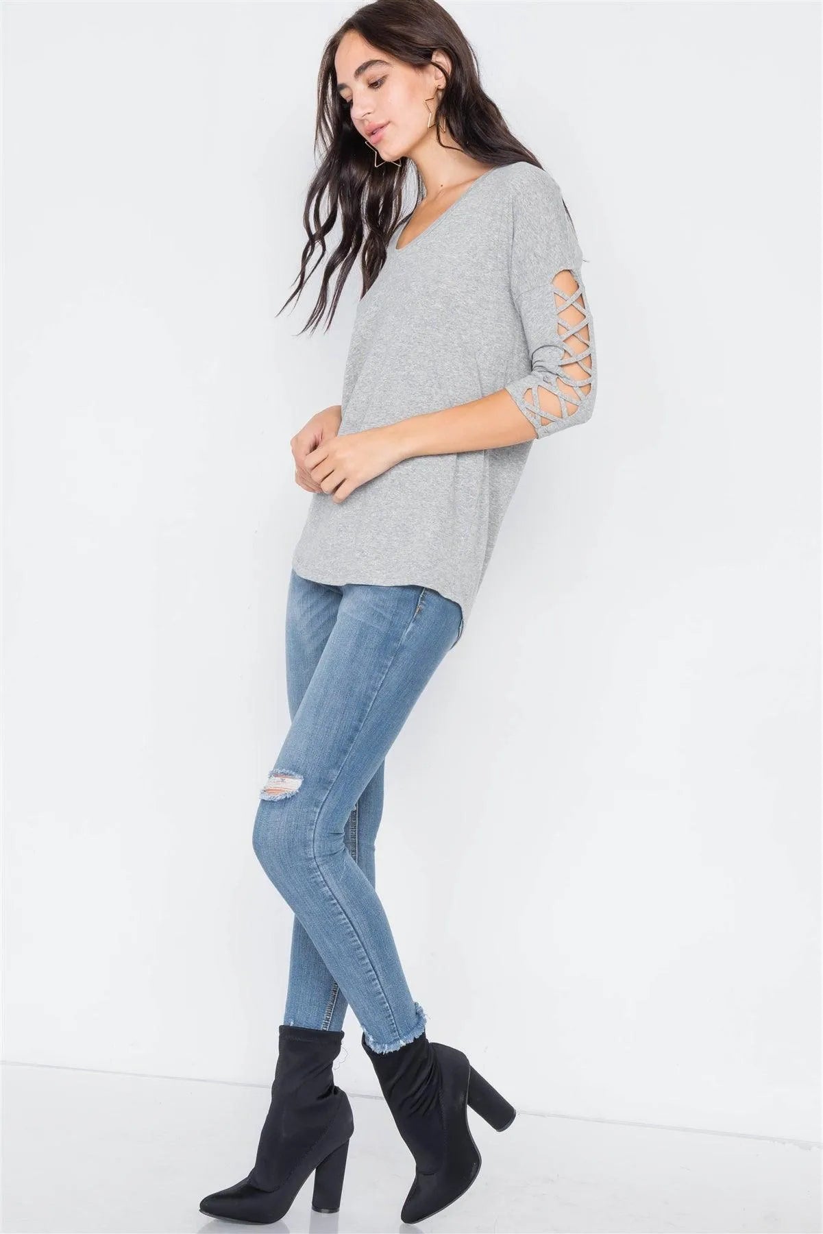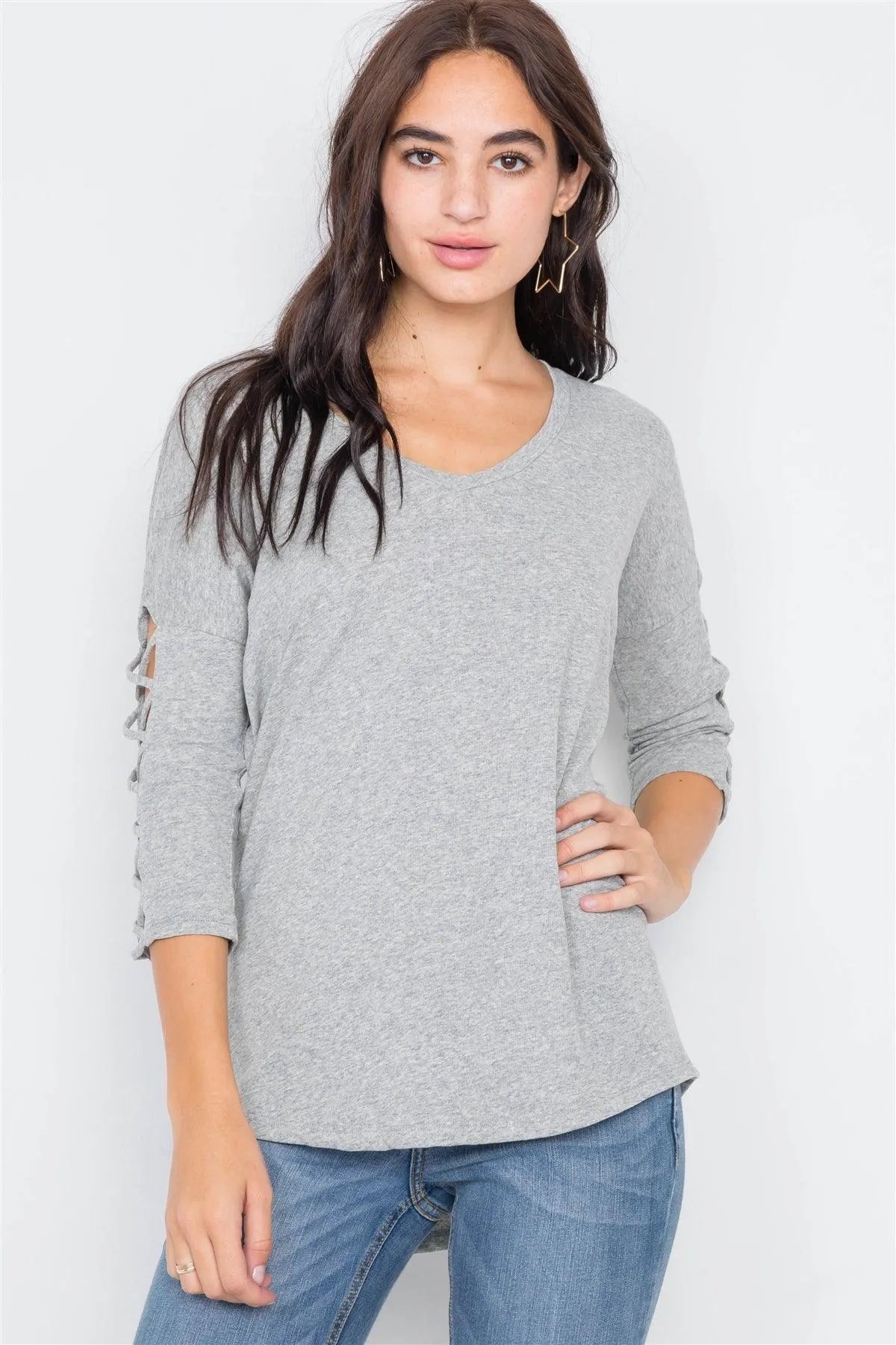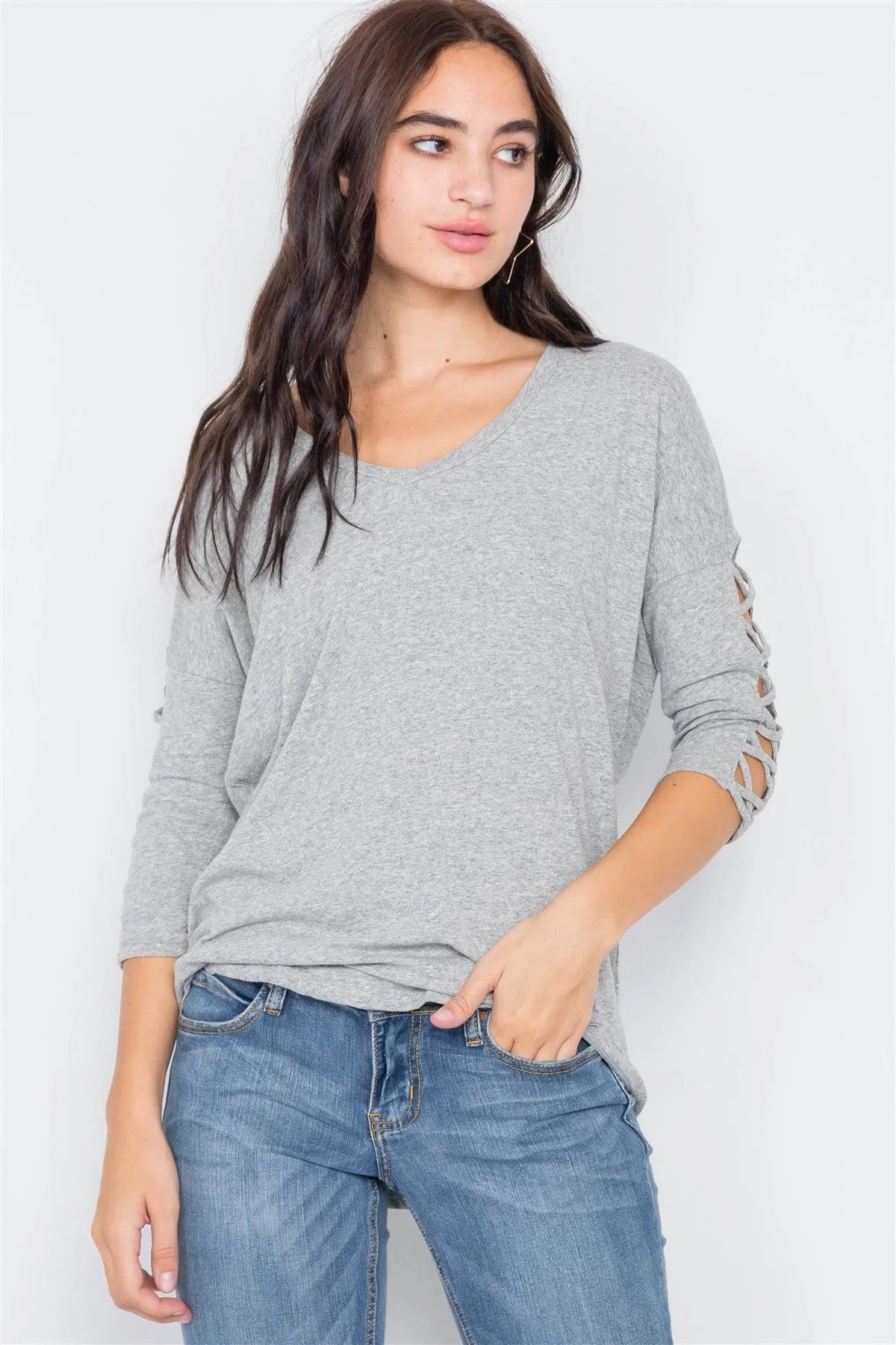 Heather Grey Drop Shoulder Braided Sleeve Round Hem Top /3-2-1