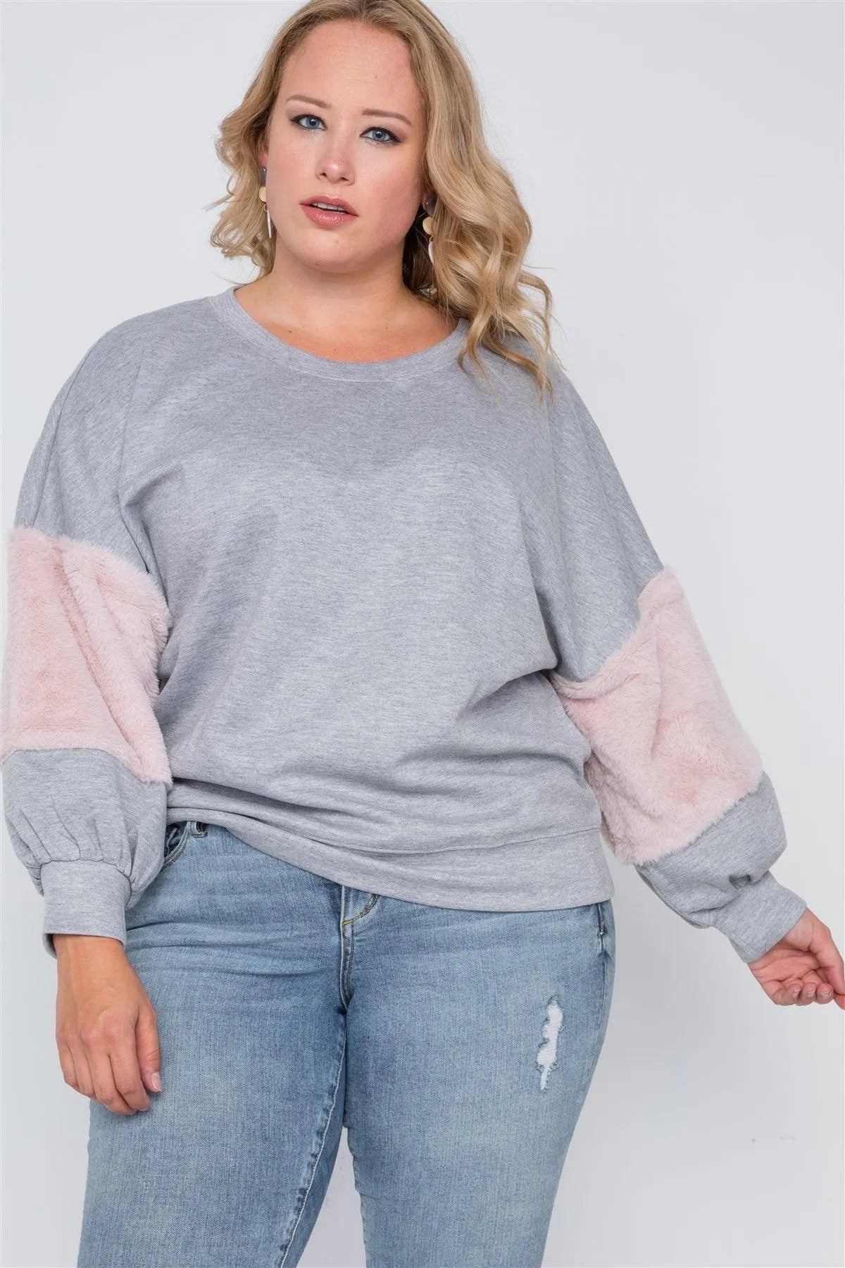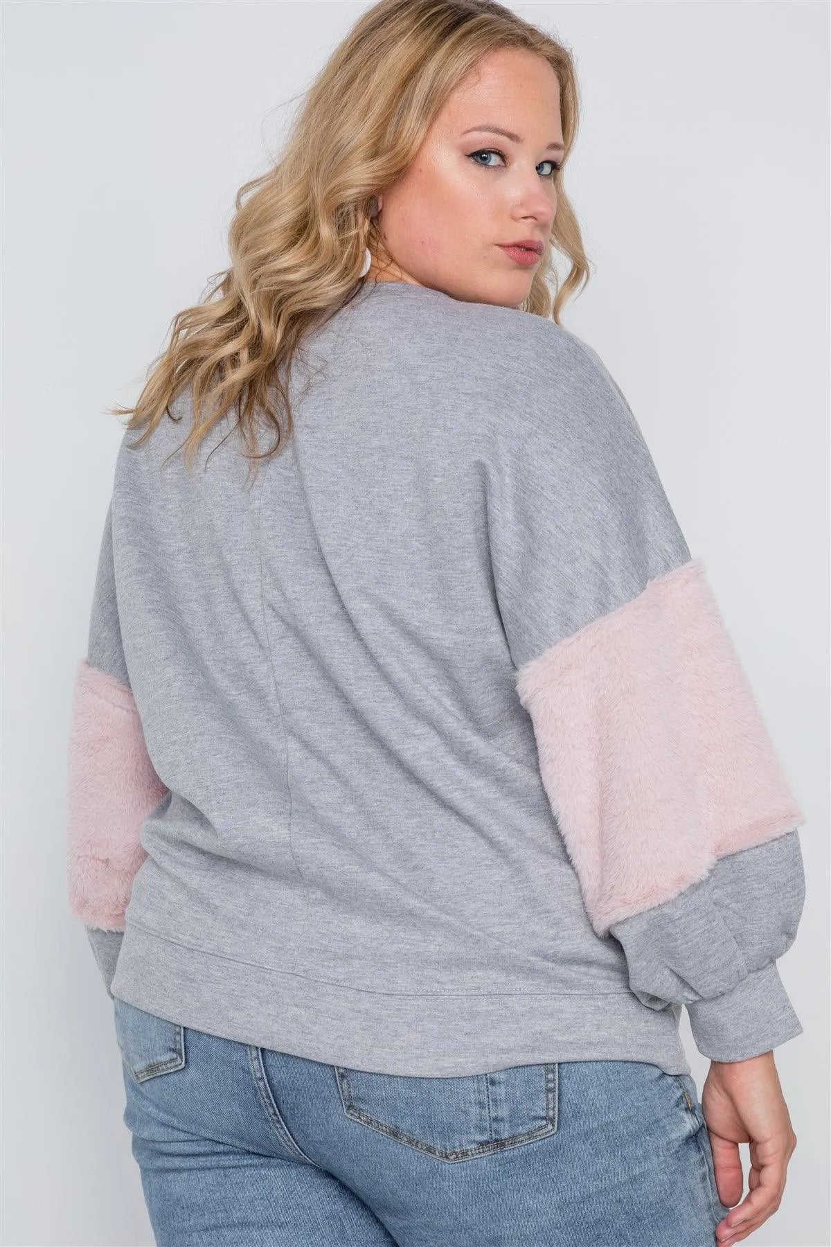 Plus Size Heather Grey Faux Fur Pink Sleeves Sweater /2-2-2