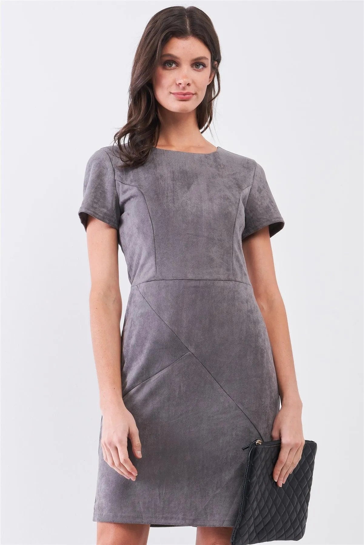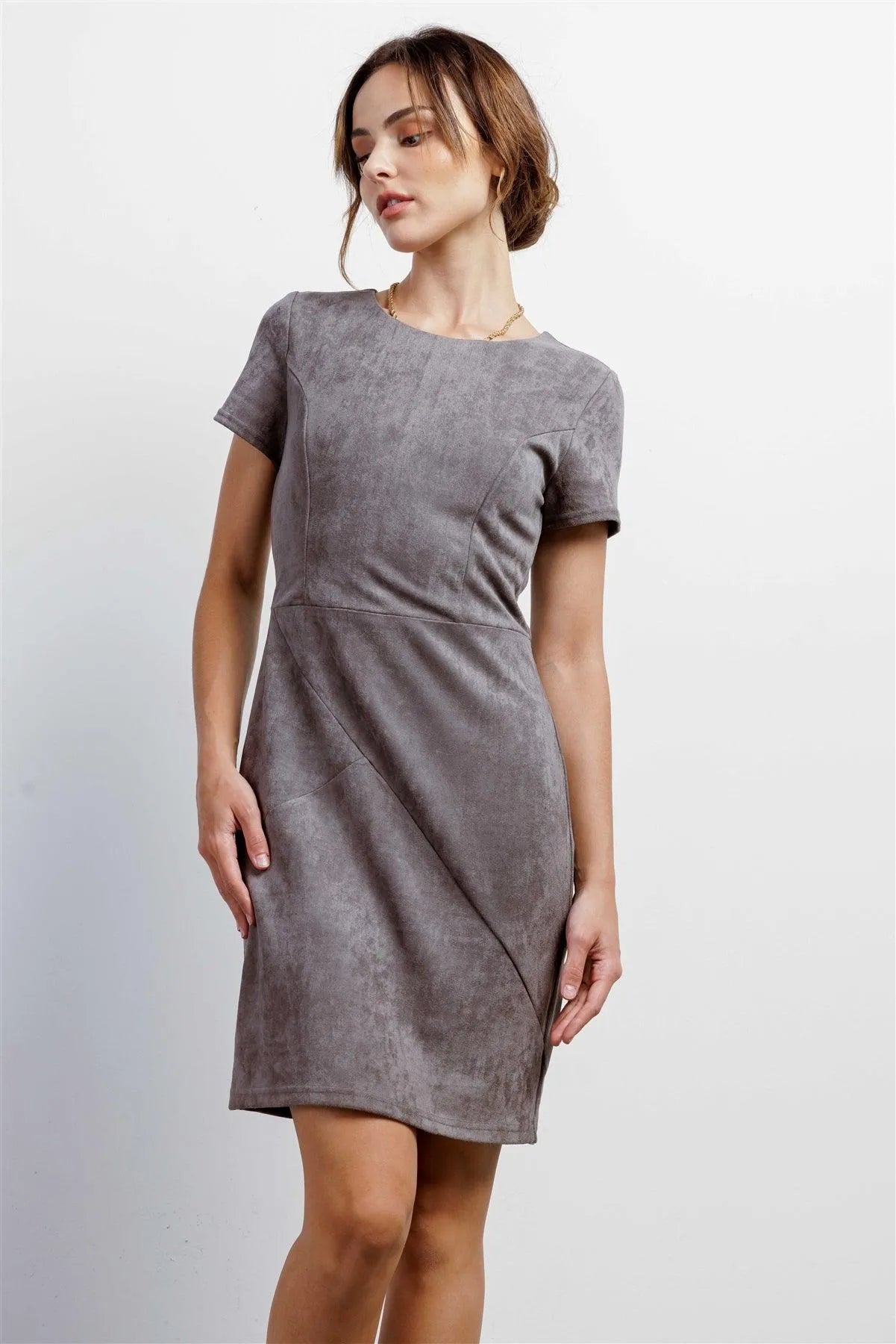 Heather Grey Faux Suede Short Sleeve Round Neck Fitted Mini Dress /1-2-2-1