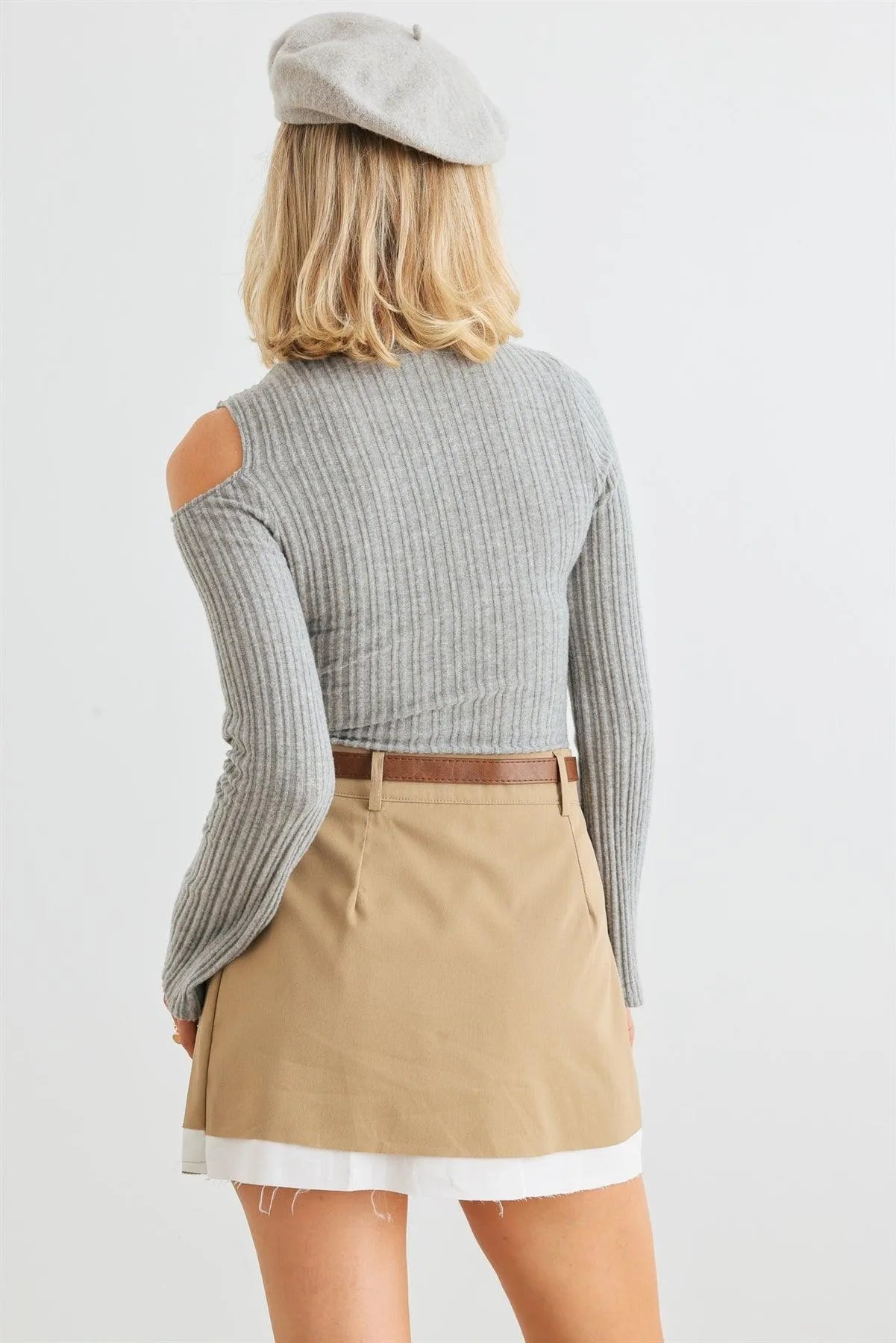Heather Grey Flannel Ribbed Bell Sleeve Cold Shoulder Bodysuit /3-2-1