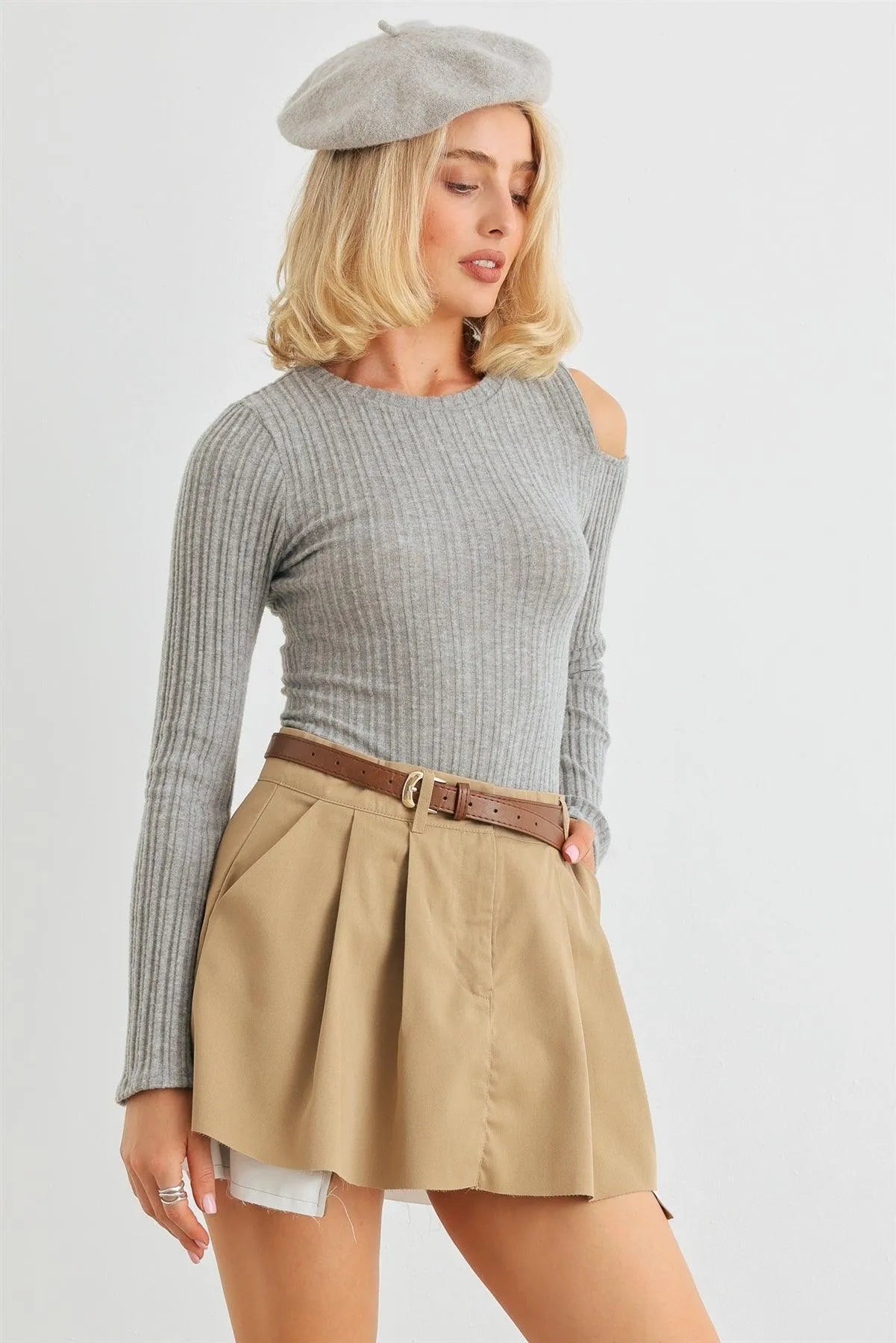 🖤 Item Features: Heather grey, solid color, ribbed texture, flannel material, one cold shoulder detail, bell long sleeves, crew neckline, thong double button closure, slim fit, stretchy, not see through, unlined, basic, casual, perfect everyday look, girlish, cute